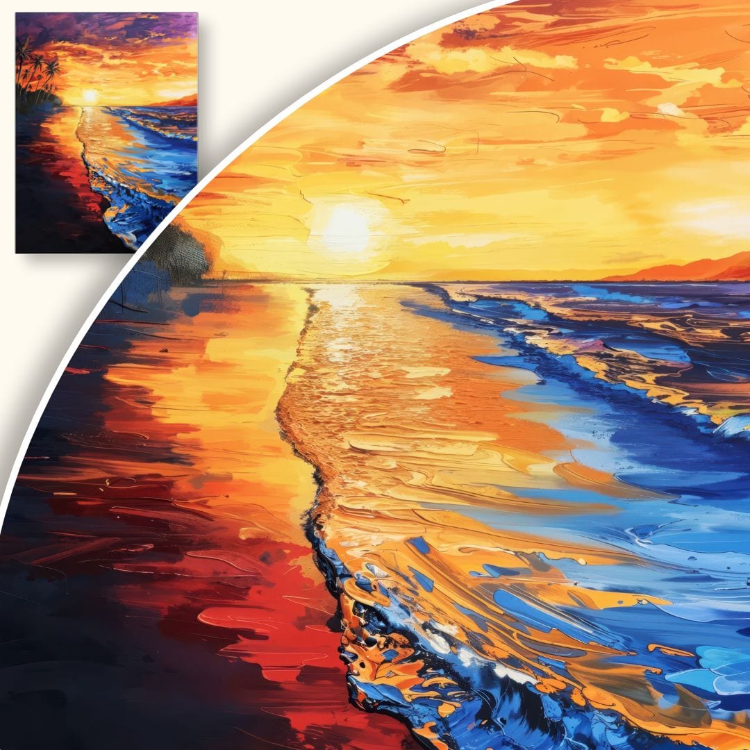 Ten obraz na płótnie przedstawia zachwycający zachód słońca nad morzem, ukazując malowniczą plażę ozdobioną smukłymi palmami i dynamicznymi falami rozbijającymi się o brzeg. Malarska wizja urzeka harmonią barw oraz grą światła, zapraszając widza do chwili zadumy i wytchnienia przy pięknie natury.