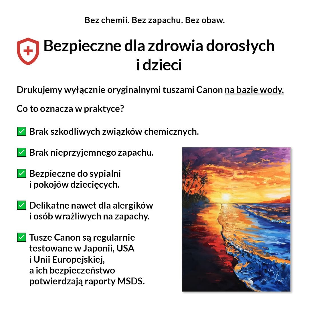 Tak, absolutnie! Drukujemy wyłącznie certyfikowanymi, bezwonnymi tuszami pigmentowymi Canon Lucia Pro na bazie wody. Są one w pełni bezpieczne dla zdrowia, nie zawierają rozpuszczalników i mogą być bez obaw stosowane w sypialniach i pokojach dziecięcych.
