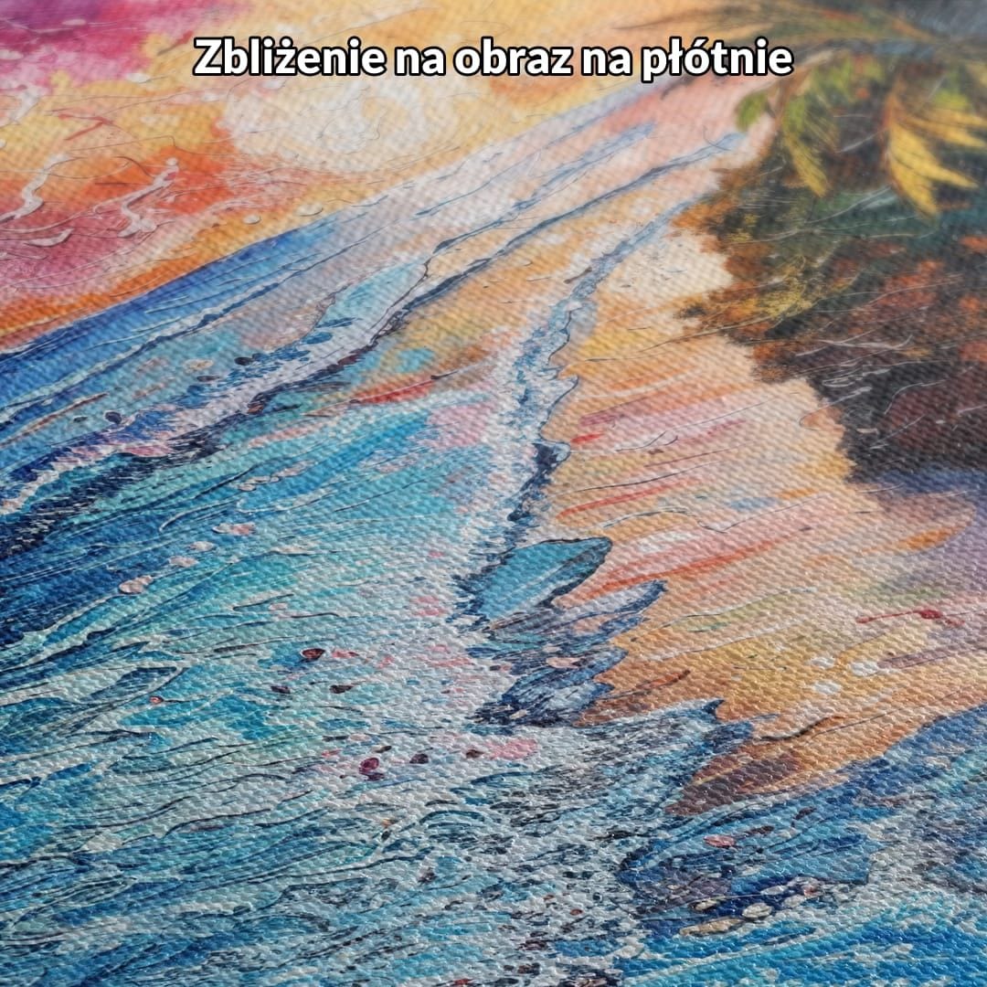 Obraz na płótnie przedstawia niezwykle malowniczy nadmorski pejzaż z zachodem słońca. Na pierwszym planie dostrzec można dynamiczne, spienione fale uderzające o brzeg oraz plażę skąpaną w miękkim, złocistym świetle. W tle rozpościerają się smukłe palmy i intensywnie kwitnące, barwne kwiaty, nadające całej kompozycji wyjątkową głębię i ekspresję. Każdy szczegół został oddany z dużą precyzją, co sprawia, że całość przyciąga spojrzenia i budzi zachwyt.