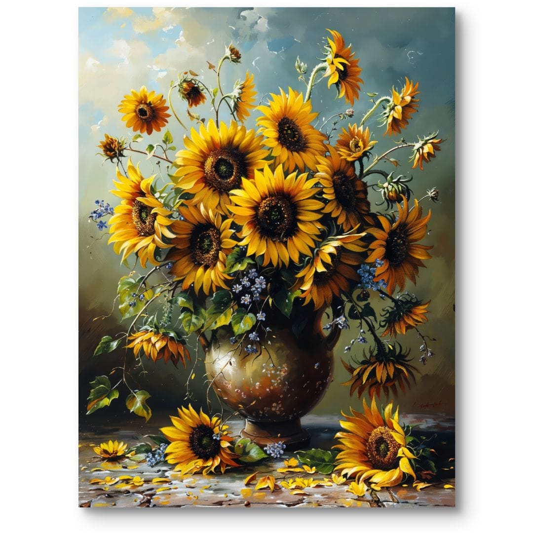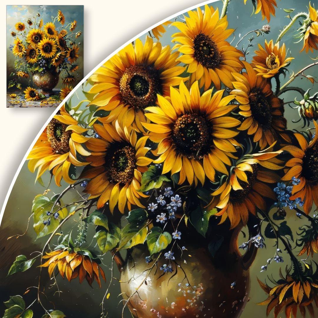 Obraz na płótnie ukazuje zachwycający bukiet słoneczników w wazonie, ustawionym na stole. Słoneczniki tętnią energią, z intensywnie żółtymi płatkami i wyrazistymi, ciemnymi środkami, które przyciągają wzrok. Swobodnie opadające kwiaty na brzegach kompozycji wprowadzają realizm i naturalność. Całość dopełniają subtelne niebieskie kwiatki i bujna zieleń liści, budując harmonijną, pozytywną aurę tej malarskiej sceny.
