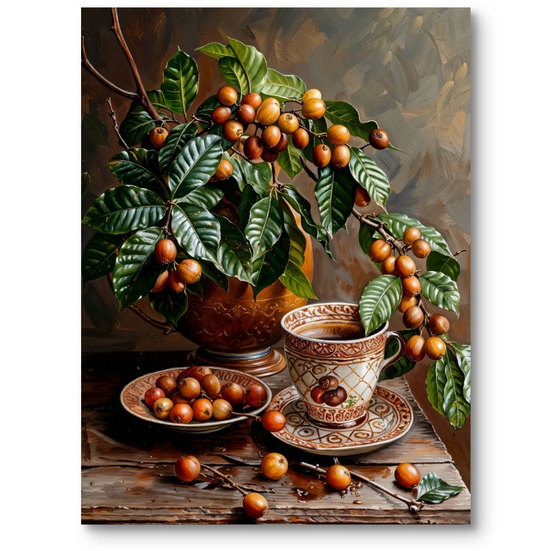 Obraz zachwyca realistycznym przedstawieniem martwej natury z motywem kawowych gałęzi, porcelanowej filiżanki oraz talerzyka wypełnionego dojrzałymi owocami kawowca. To kompozycja, w której niezwykła dbałość o detale – od lśniących liści po misterne zdobienia porcelany – przenosi widza w spokojny i harmonijny świat codzienności. Dzieło odzwierciedla nie tylko piękno przyrody, ale też wyjątkowość przedmiotów, z którymi obcujemy podczas chwil relaksu.