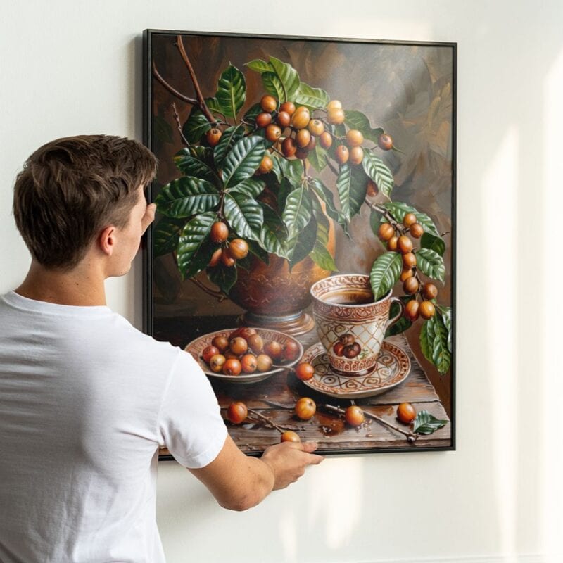 Kompozycja dzieła jest starannie wyważona – centrum obrazu tworzą kawowe gałęzie z subtelnie ustawioną filiżanką, na które miękko pada światło, podkreślając naturalne tekstury i delikatne cienie. Harmonia zieleni, brązów oraz eleganckiej bieli stwarza atmosferę ciepła i przytulności, doskonale wpisując się w domowe wnętrza.