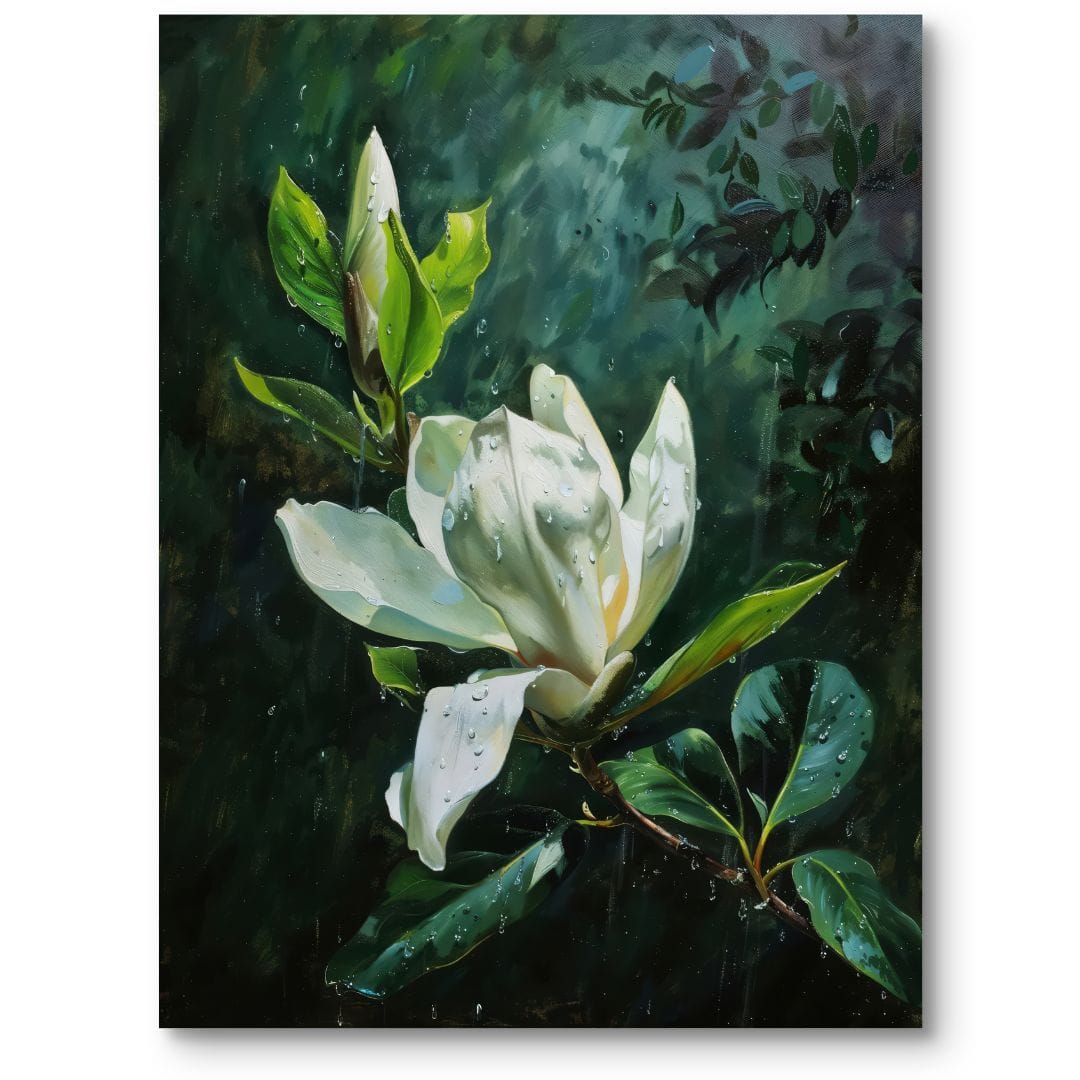 Obraz na płótnie ukazuje olśniewającą magnolię w pełni rozkwitu, zroszoną subtelnymi kroplami rosy, które dodają kompozycji świeżości i wyrazistości. Delikatne płatki kwiatów kontrastują na tle głębokiej zieleni liści, tworząc harmonijną, naturalną całość. Ten motyw podkreśla niepowtarzalne piękno i wyjątkowość rośliny.