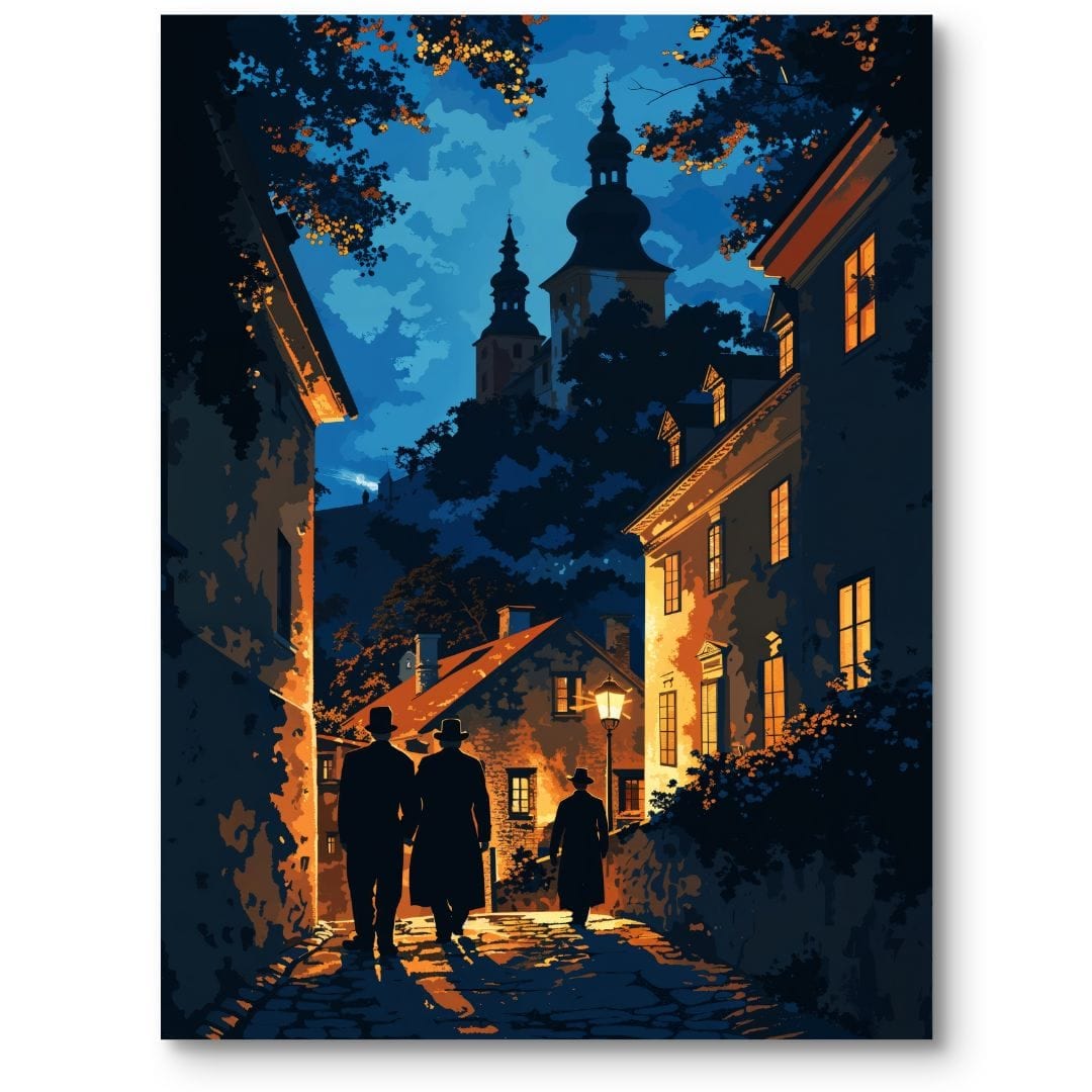Obraz na płótnie prezentuje urzekający widok nocnego miasta. Urokliwa, wąska uliczka biegnąca między zabytkowymi kamienicami, których okna rozświetlają ciepłe, pomarańczowe światła, wprowadza widza w atmosferę wieczornego spokoju. W oddali górują dwie monumentalne wieże o gotyckich zdobieniach, budujące tło pełne historii. Na pierwszym planie troje elegancko ubranych postaci przechadza się wśród cieni, dodając kompozycji nuty nostalgii i subtelnej tajemniczości.