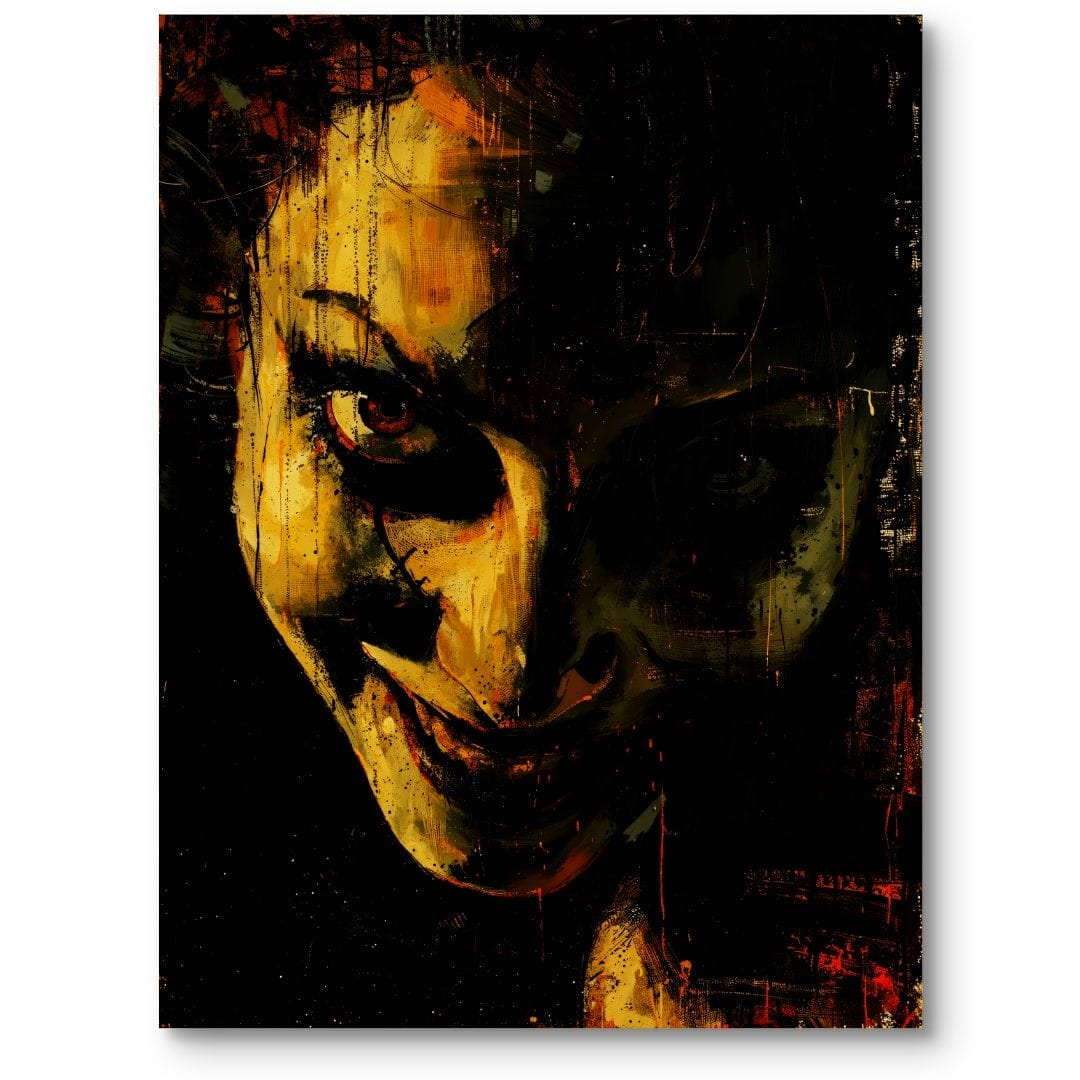 Obraz ukazuje intrygującą, mroczną postać o niemal groteskowym charakterze. Ekspresyjnie oddane rysy twarzy, hipnotyzujące, głęboko osadzone oczy oraz intensywna paleta barw budują silne napięcie i emocje, wywołując u widza niepokój i fascynację jednocześnie. Tematyka dzieła przywołuje na myśl atmosferę grozy i surrealistycznej tajemnicy, idealnie oddając klimat horroru.
