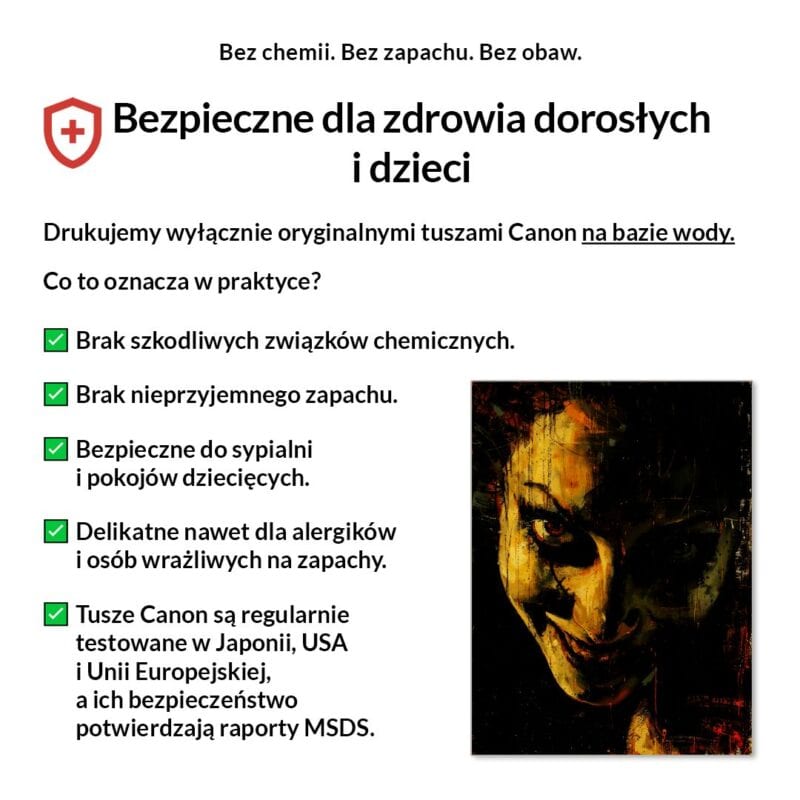 Tak, absolutnie! Drukujemy wyłącznie certyfikowanymi, bezwonnymi tuszami pigmentowymi Canon Lucia Pro na bazie wody. Są one w pełni bezpieczne dla zdrowia, nie zawierają rozpuszczalników i mogą być bez obaw stosowane w sypialniach i pokojach dziecięcych.