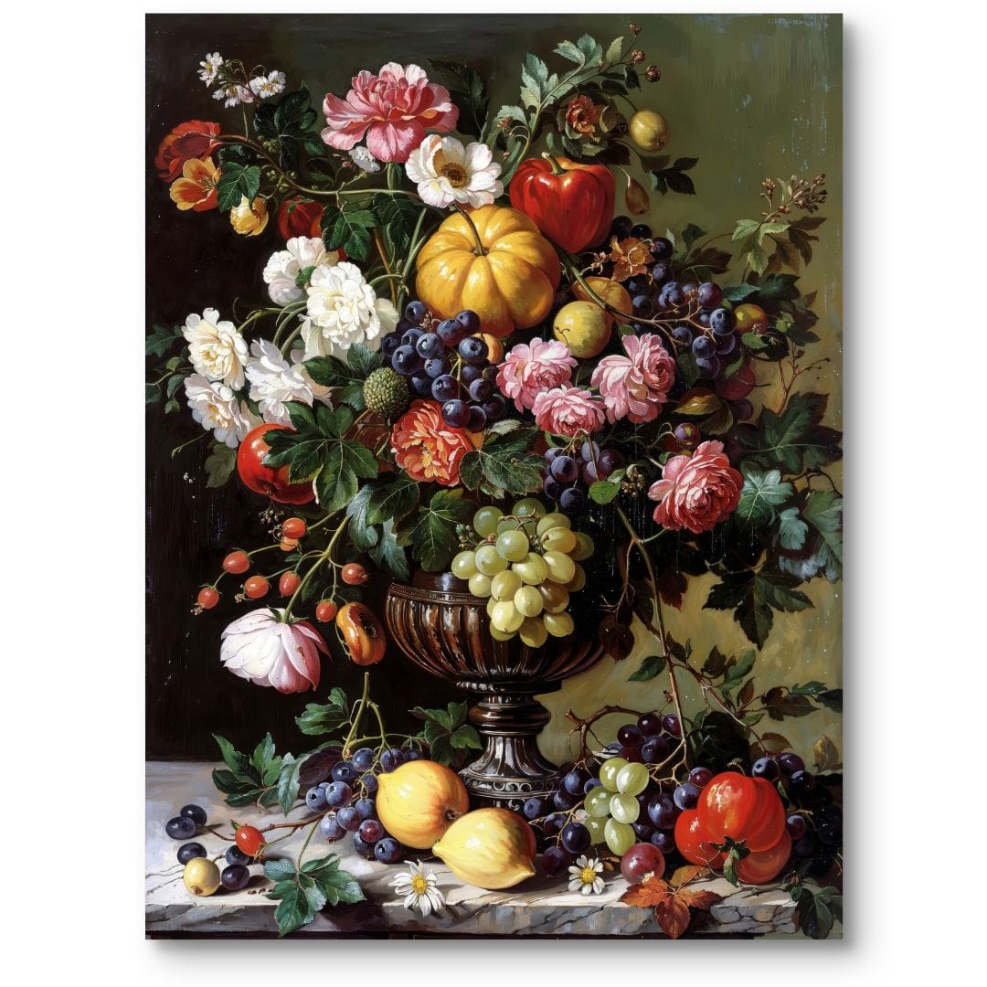 Obraz na płótnie ukazuje zachwycającą martwą naturę, w której bogato skomponowany bukiet kwiatów – z przewagą róż i peonii – przeplata się z soczystymi owocami: winogronami, jabłkami oraz gruszkami. Kompozycja wyróżnia się niezwykłą różnorodnością barw i detali, przenosząc w świat klasycznej elegancji i obfitości natury.