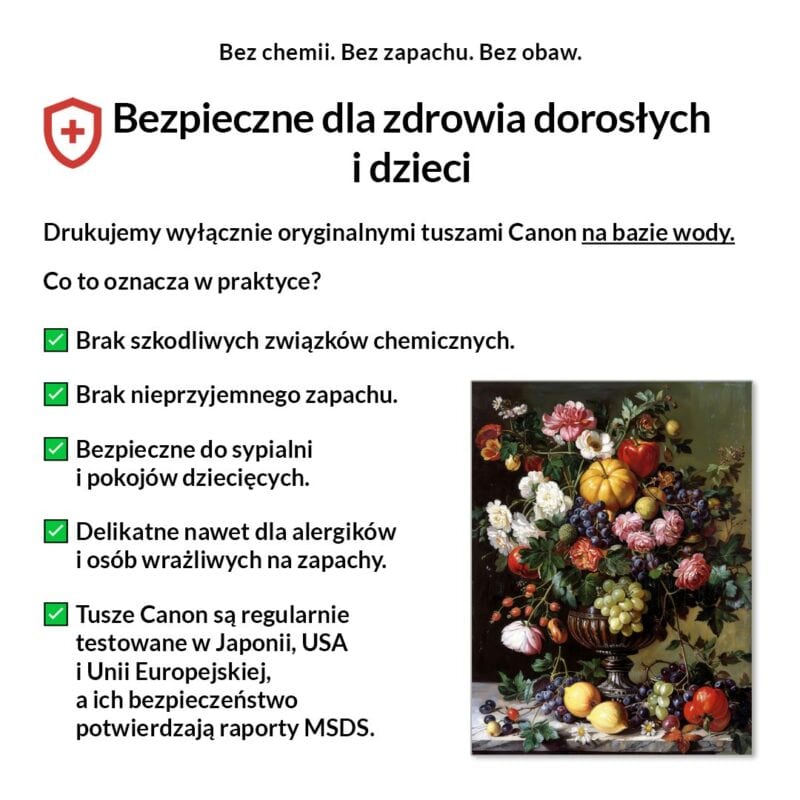 Tak, absolutnie! Drukujemy wyłącznie certyfikowanymi, bezwonnymi tuszami pigmentowymi Canon Lucia Pro na bazie wody. Są one w pełni bezpieczne dla zdrowia, nie zawierają rozpuszczalników i mogą być bez obaw stosowane w sypialniach i pokojach dziecięcych.