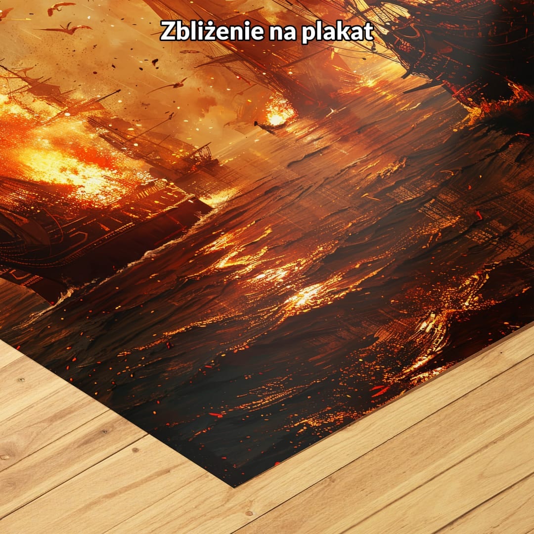 Obraz ukazuje epicką scenę historycznej bitwy morskiej, gdzie majestatyczne żaglowce ogarnięte płomieniami walczą podczas spektakularnego zachodu słońca. Szczegółowo oddane płomienie i wirujący dym unoszący się ponad statkami budują atmosferę pełną napięcia i chaosu. Ta dynamiczna kompozycja porywa widza w sam środek dramatycznych wydarzeń, wymownie podkreślając siłę historii oraz emocje towarzyszące morskim potyczkom.
