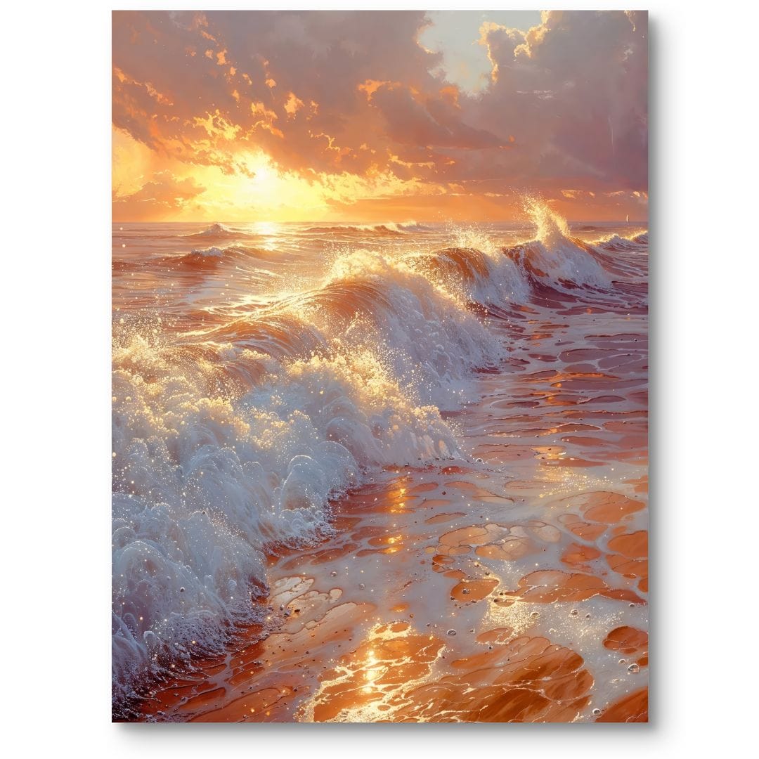 Obraz malowany farbami olejnymi utrzymany jest w stylu impresjonistycznym. Dynamiczny pociągnięcia pędzla oddają energię fal, a miękkie przejścia barw idealnie oddają atmosferę zachodu słońca. Staranna gra światła – charakterystyczna dla impresjonizmu – sprawia, że dzieło urzeka detalem i subtelnością.