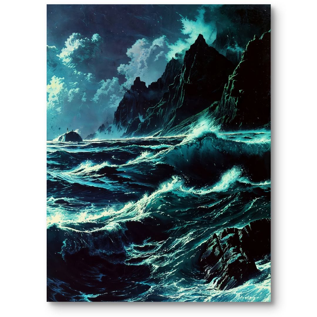 Obraz na płótnie przedstawia fascynujący, burzowy krajobraz morski, w którym natura ukazuje swoją dziką potęgę. W centrum kompozycji znalazły się wzburzone fale, monumentalne, ciemne góry oraz groźne, niespokojne niebo. Artysta mistrzowsko oddał dynamiczny ruch żywiołów: nocna burza rozszalała się nad morzem, a woda z impetem roztrzaskuje się o strome zbocza, tworząc aurę tajemnicy i dramatyzmu. To wizualna opowieść o sile oraz nieokiełznanym charakterze przyrody.