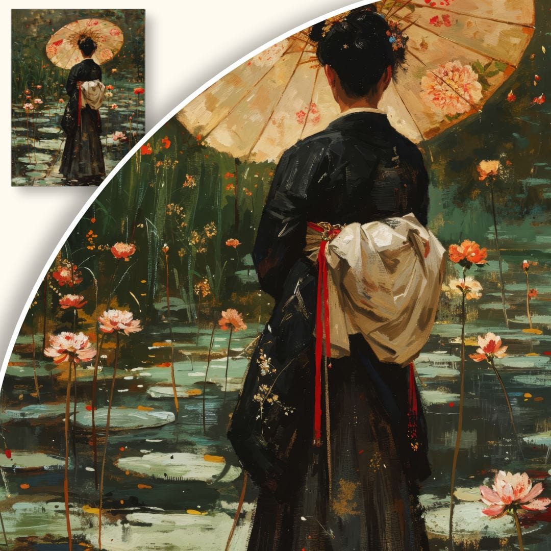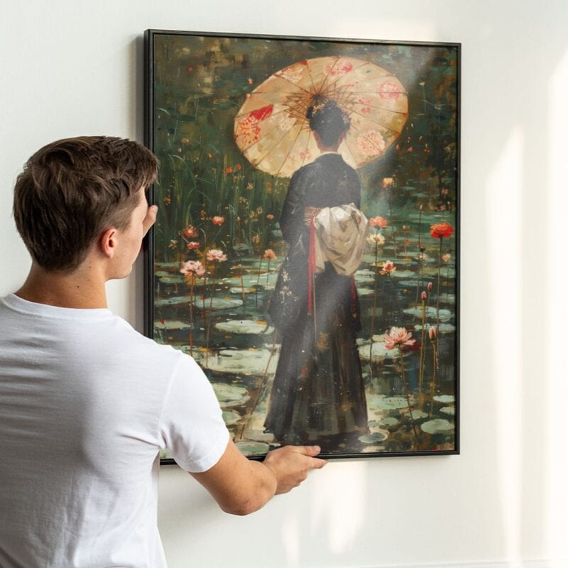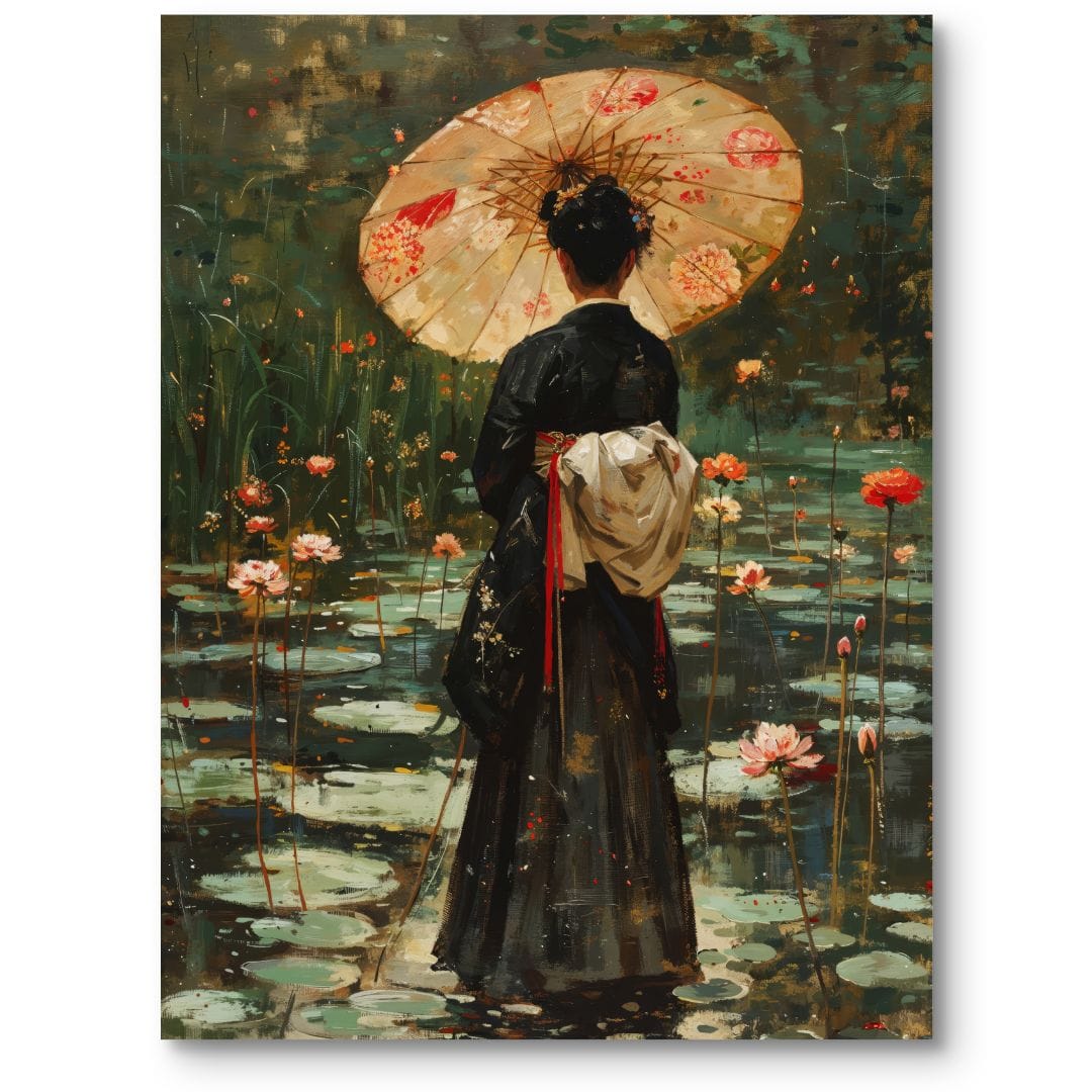 Obraz na płótnie przedstawia elegancką kobietę w tradycyjnym japońskim stroju, trzymającą delikatną parasolkę i zatrzymującą się na brzegu stawu pełnego lilii wodnych. Jej wyrafinowana sylwetka tworzy piękny kontrast z feerią barw kwiatów wokół niej, co nadaje całości romantyczny, niemal baśniowy klimat.