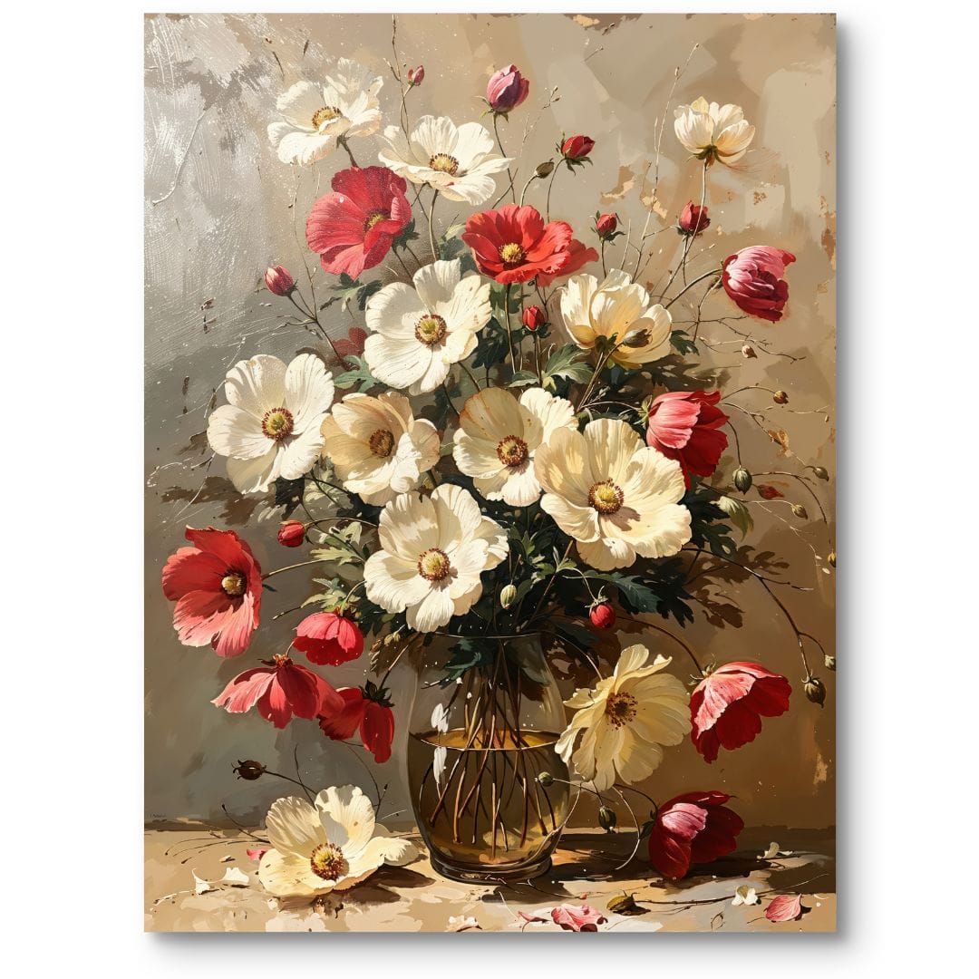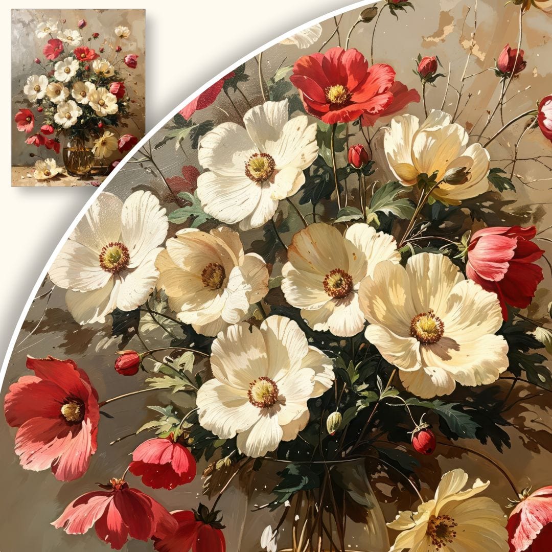Ten wyjątkowy obraz na płótnie to mistrzowsko wykonana realistyczna kompozycja, ukazująca bukiet kwiatów w eleganckim wazonie. Na pierwszym planie uwagę przyciągają biało-czerwone maki, otoczone przez subtelne, delikatne kwiaty o rozświetlonych płatkach. Całość wypełnia przyjemne, ciepłe światło, które podkreśla naturalne piękno i harmonię tej kwiatowej martwej natury.
