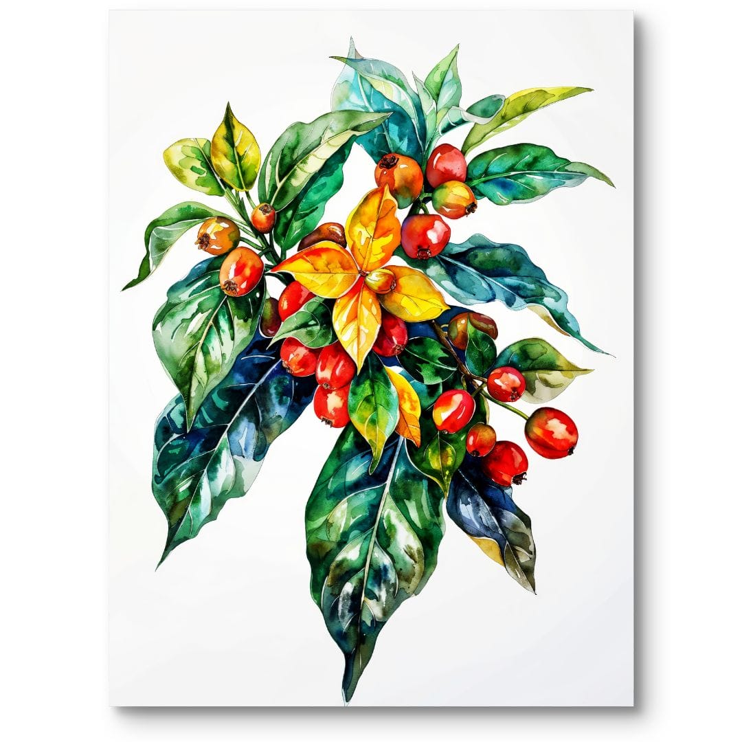 Obraz na płótnie prezentuje bogactwo przyrody w najbardziej barwnym i intensywnym wydaniu. Soczyście zielone liście i apetyczne owoce tworzą kompozycję, która zachwyca świeżością oraz naturalnym pięknem. Dbałość o detale roślinne czyni ten obraz doskonałym wyborem dla pasjonatów botanicznych ilustracji i miłośników unikalnych dekoracji ściennych.