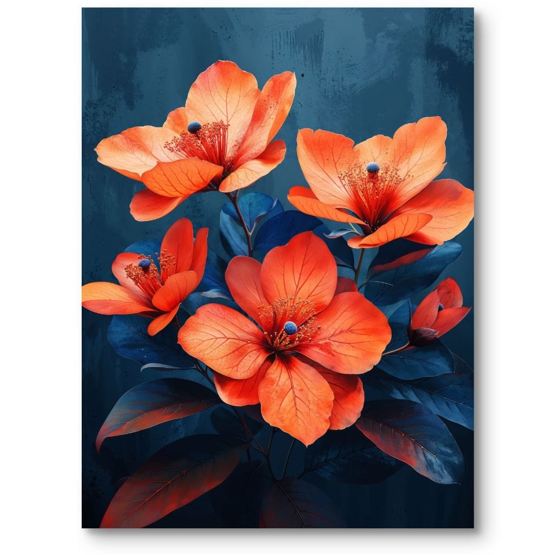 Obraz prezentuje zachwycający bukiet intensywnie pomarańczowych kwiatów, kontrastujących dynamicznie z barwnym, niebiesko-czerwonym tłem. Artysta w mistrzowski sposób ukazuje urok naturalności, eksponując finezyjne detale płatków i liści, co podkreśla niezwykłe bogactwo przyrody.