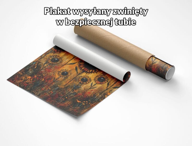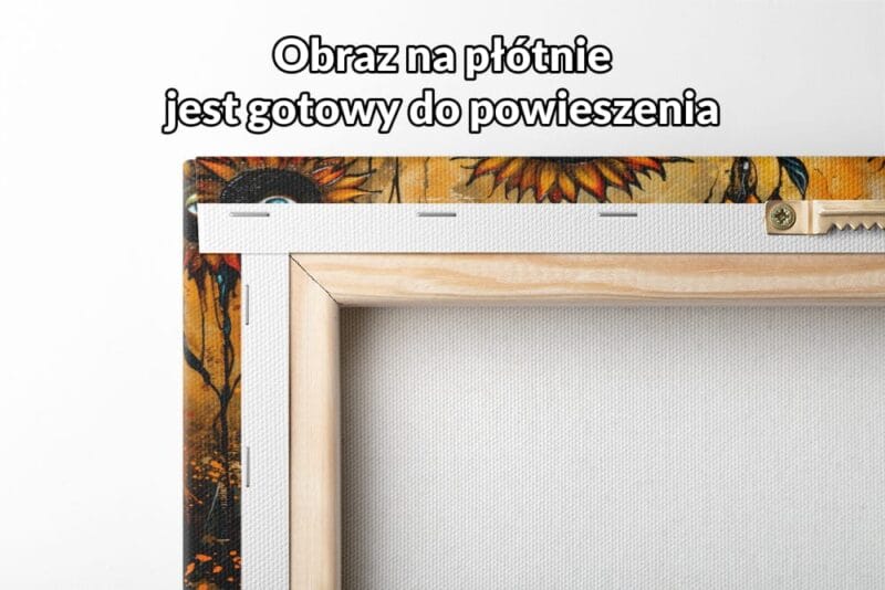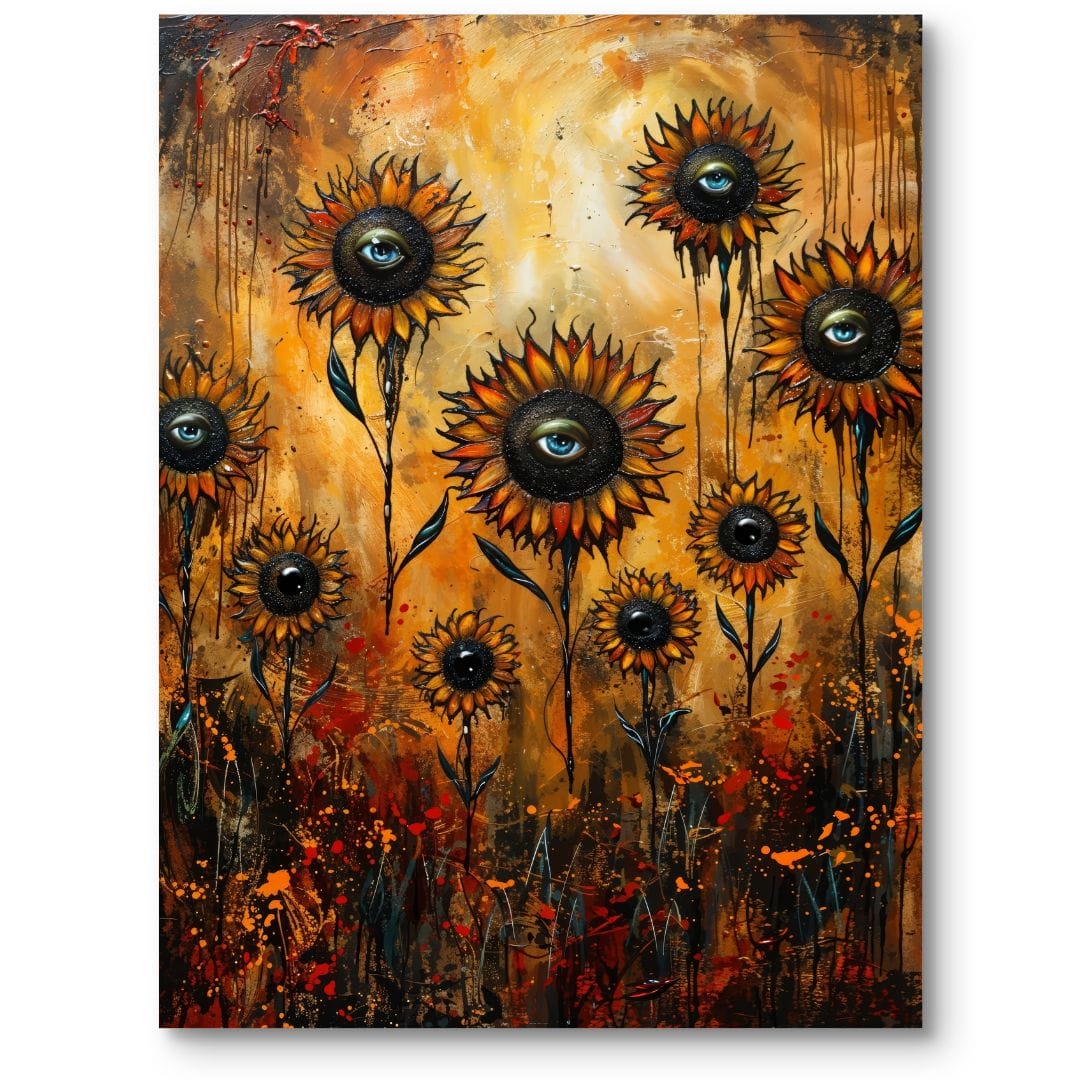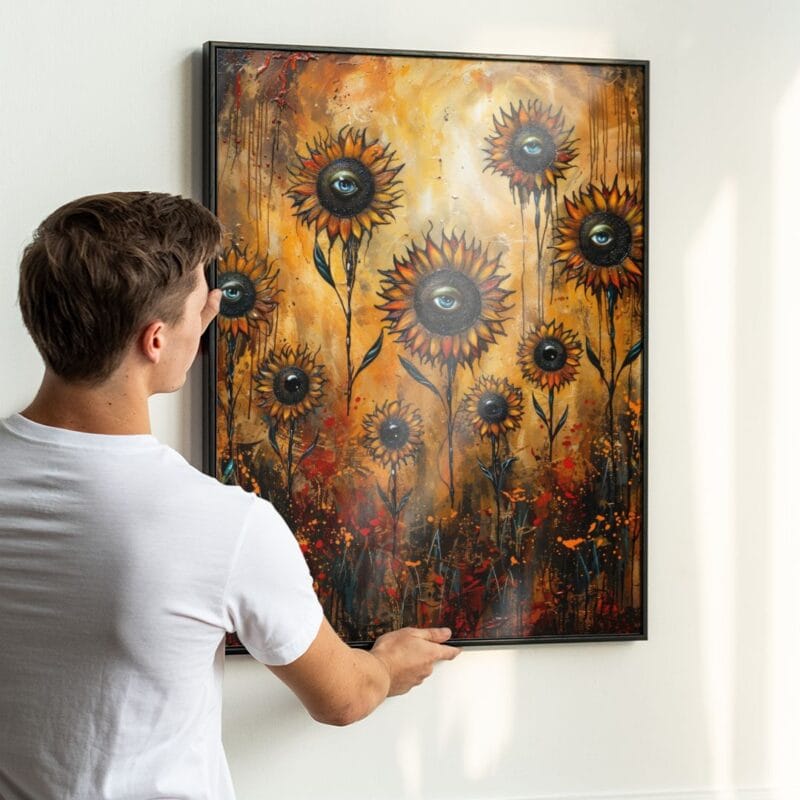 Ten niezwykły obraz na płótnie przenosi klasyczny motyw słoneczników w zupełnie nowy, surrealistyczny wymiar – zamiast tradycyjnych środków kwiatów pojawiają się tajemnicze oczy, które czuwają niczym strażnicy skrytej symboliki. Rośliny wyrastają z pulsującej energią ziemi, a ich płatki wirują w hipnotyzujących odcieniach pomarańczu, żółci i czerni. Na pierwszy rzut oka kompozycja odwołuje się do natury, jednak to niespodziewane zestawienie z elementem fantastycznym wprowadza fascynującą wielowarstwowość i niepowtarzalną aurę obrazu.