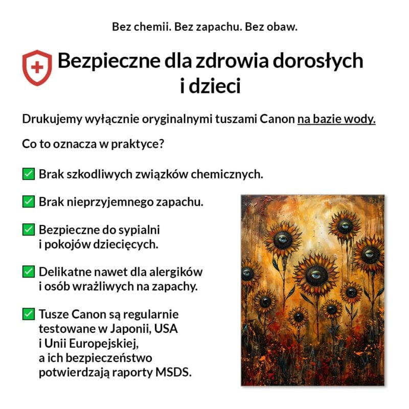 Tak, absolutnie! Drukujemy wyłącznie certyfikowanymi, bezwonnymi tuszami pigmentowymi Canon Lucia Pro na bazie wody. Są one w pełni bezpieczne dla zdrowia, nie zawierają rozpuszczalników i mogą być bez obaw stosowane w sypialniach i pokojach dziecięcych.