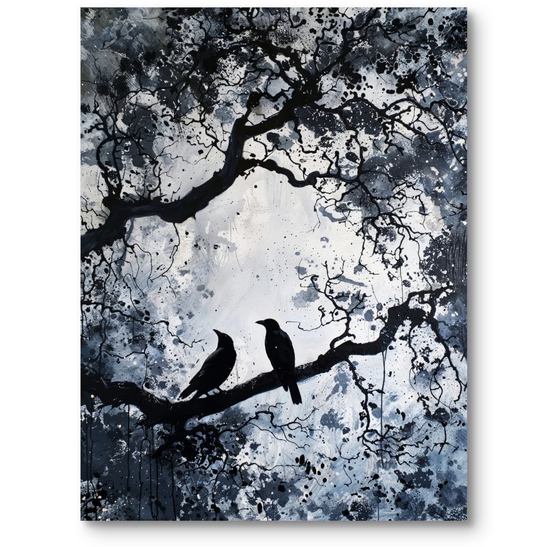 Obraz na płótnie prezentuje dwie czarne sylwetki kruków spoczywających na zakrzywionej gałęzi drzewa. Sieć finezyjnych, poplątanych konarów rozciąga się na całym tle, budując intrygującą i niemal mistyczną kompozycję. Wybór motywu przyrody – kruków oraz gałęzi – nadaje obrazowi głęboko naturalny, a zarazem nieco tajemniczy charakter.