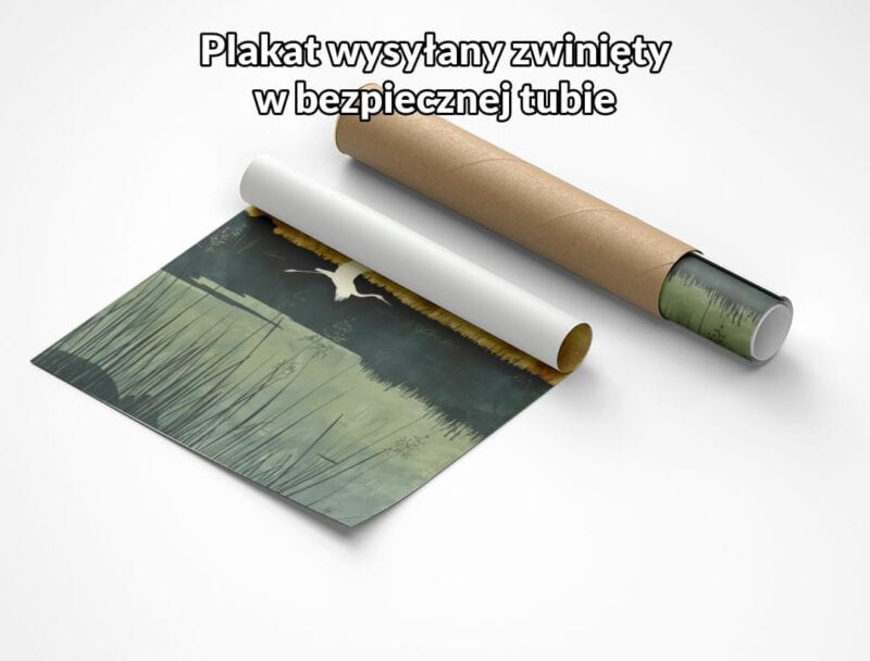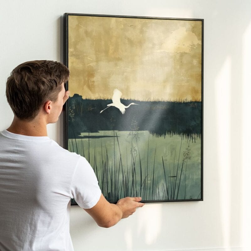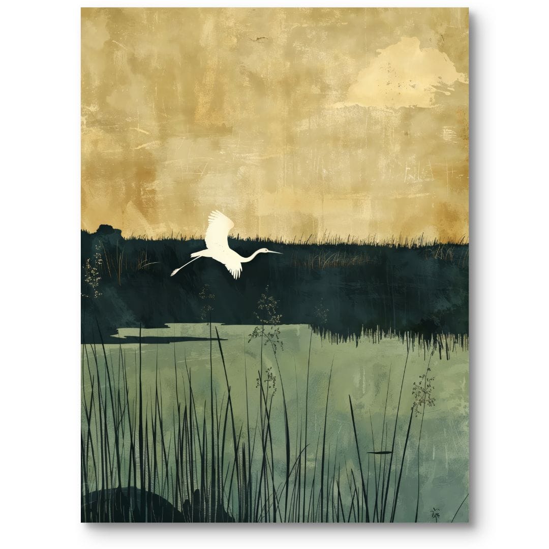 Obraz zachwyca subtelnym pejzażem – spokojne jezioro, nad którym elegancko wznosi się żuraw, stanowi centralny motyw kompozycji. Tło wypełnia soczysta zieleń roślinności oraz delikatnie zarysowane chmury, tworząc harmonijny, naturalny krajobraz pełen ukojenia i ciszy.
