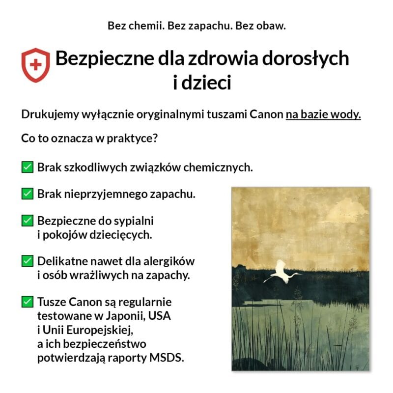 Tak, absolutnie! Drukujemy wyłącznie certyfikowanymi, bezwonnymi tuszami pigmentowymi Canon Lucia Pro na bazie wody. Są one w pełni bezpieczne dla zdrowia, nie zawierają rozpuszczalników i mogą być bez obaw stosowane w sypialniach i pokojach dziecięcych.