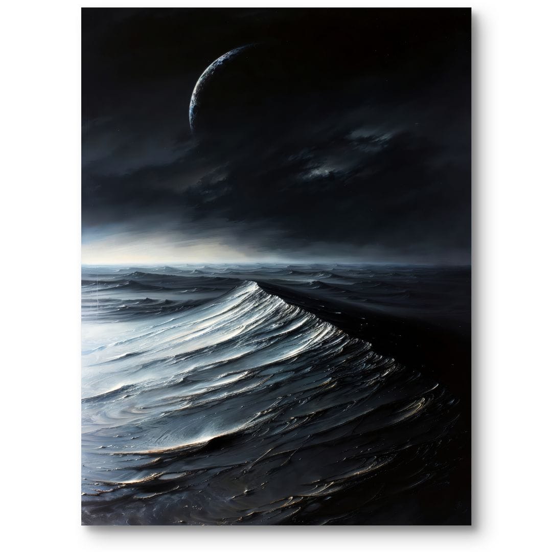 Ten niezwykły obraz przenosi widza w mistyczny, nocny krajobraz, gdzie potężne fale morskie zdają się wyłaniać z mrocznego tła burzowego nieba. Wyłaniający się zza chmur księżyc oświetla dynamiczną scenę, przenikając ją atmosferą tajemnicy i nieograniczonych głębi wszechświata. Całość zyskuje niemal magiczny, nadprzyrodzony wymiar.