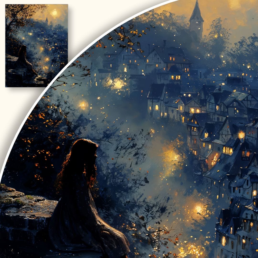 Oferowany obraz na płótnie przenosi nas w urokliwy, nocny pejzaż małego miasteczka spowitego blaskiem pełni księżyca. Z wysokości rozciąga się rozległy widok na miasto, gdzie w centrum kompozycji odnajdziemy sylwetkę zamyślonej dziewczyny, siedzącej na starym kamiennym murze. Scena uchwycona została w magicznym momencie zapadającego zmierzchu, kiedy w oknach domów zaczynają z wolna rozświetlać się pierwsze światła, nadając otoczeniu niezwykłej głębi i intymności.