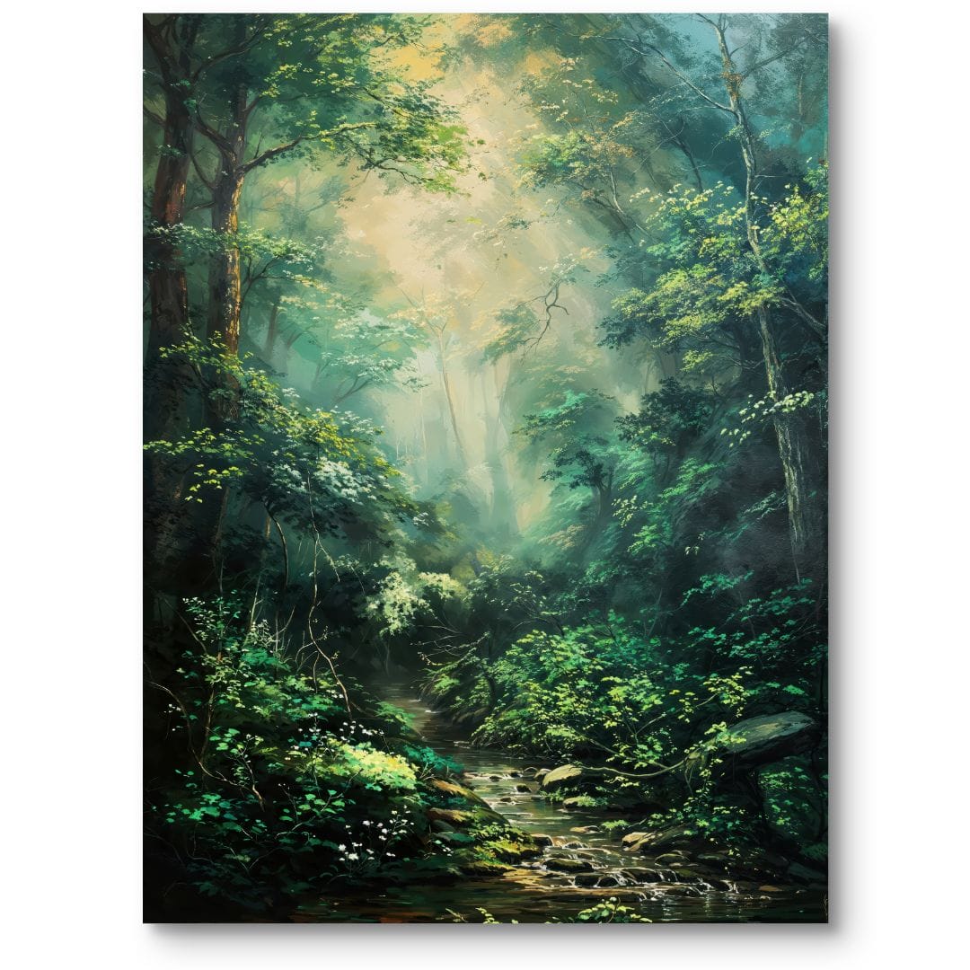 Ten obraz na płótnie zachwyca malowniczym widokiem leśnego krajobrazu, w którym przez sam środek kompozycji przepływa krystaliczny potok. Promienie słonecznego światła delikatnie przenikają przez gęstą ścianę zielonej roślinności, nadając całości tajemniczości i wyjątkowego spokoju. Dzieło oddaje czar i esencję natury w jej najczystszej, pierwotnej formie, oddziałując na zmysły i przypominając o pięknie, jakiego można doświadczyć wśród drzew. Potok, nadający scenie dynamiki, zachęca do kontemplacji i zanurzenia się w harmonii przyrody.