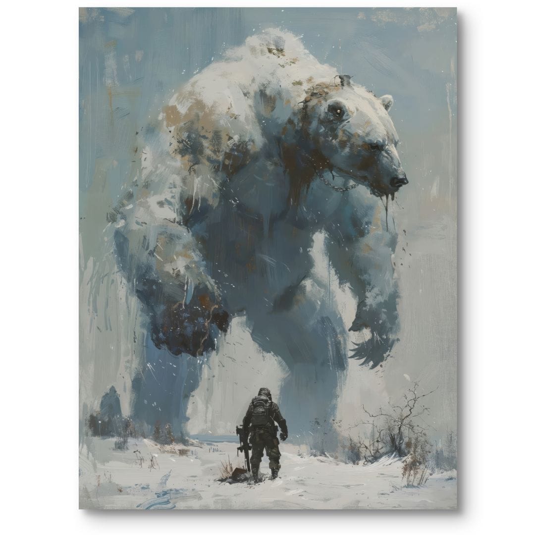 Obraz na płótnie ukazuje niezwykłą scenę fantastyczną, w której gigantyczny niedźwiedź polarny staje naprzeciw samotnego człowieka wyposażonego w sprzęt do przetrwania w arktycznych warunkach. Mityczna wielkość zwierzęcia nadaje całej konfrontacji aurę tajemniczości i przywołuje na myśl legendy o siłach natury, przekraczających ludzkie możliwości. Scenerię dopełniają śnieżne tło wraz z parą unoszącą się z oddechów bohaterów, pogłębiając klimat zimowej przygody.