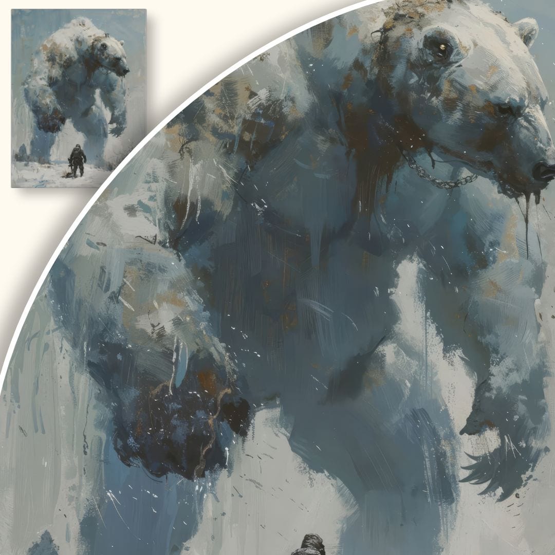 Motyw monumentalnych zwierząt i ich spotkania z człowiekiem od wieków fascynuje artystów – od romantycznych obrazów Caspara Davida Friedricha po współczesną fantastykę ilustrowaną przez takich twórców jak Simon Stålenhag. Obecność mitycznego niedźwiedzia na zimowej scenie przywołuje na myśl stare legendy i dawne podania ludów północy, w których zwierzęta bywały strażnikami tajemnic lub odwiecznymi przeciwnikami człowieka.