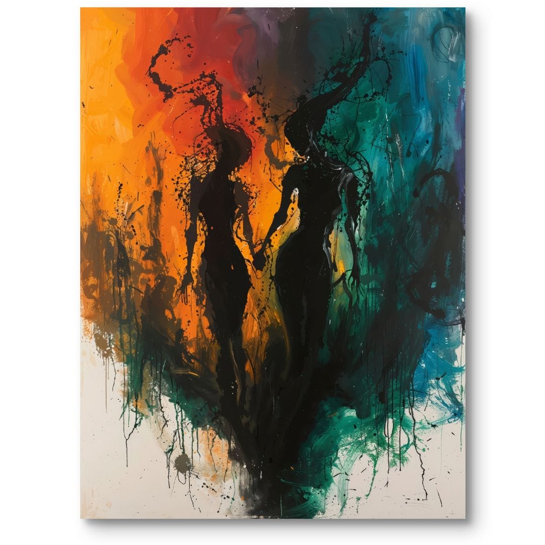 Obraz ukazuje dwie abstrakcyjne kobiece sylwetki splecione dłońmi, wyłaniające się z barwnego tła, w którym dominują przenikające się pomarańcze i zielenie. Ta dynamiczna kompozycja wyraża intensywność emocji oraz głębokość łączącej postacie relacji.