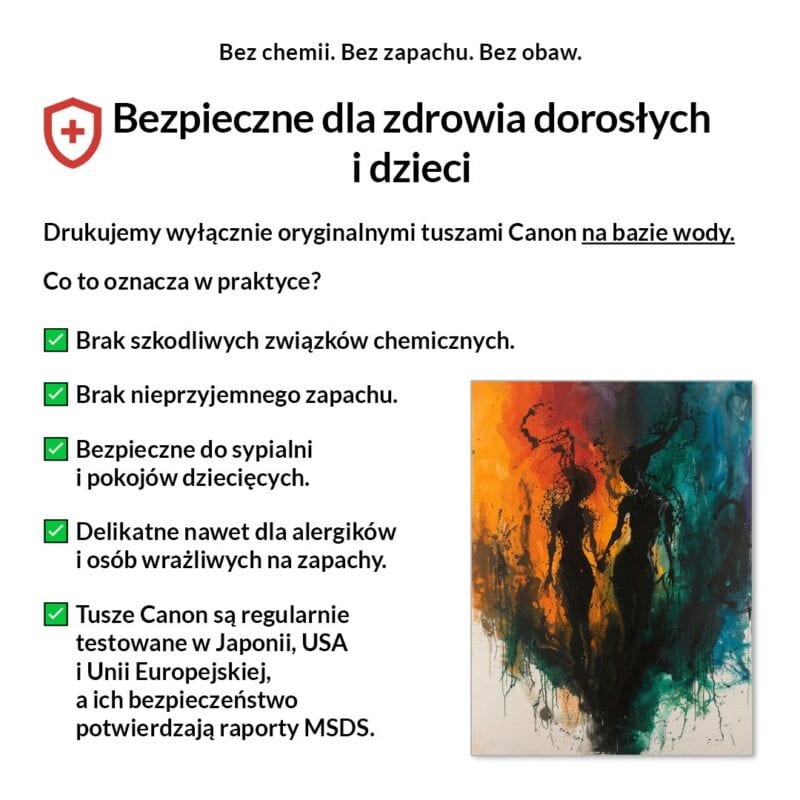 Tak, absolutnie! Drukujemy wyłącznie certyfikowanymi, bezwonnymi tuszami pigmentowymi Canon Lucia Pro na bazie wody. Są one w pełni bezpieczne dla zdrowia, nie zawierają rozpuszczalników i mogą być bez obaw stosowane w sypialniach i pokojach dziecięcych.