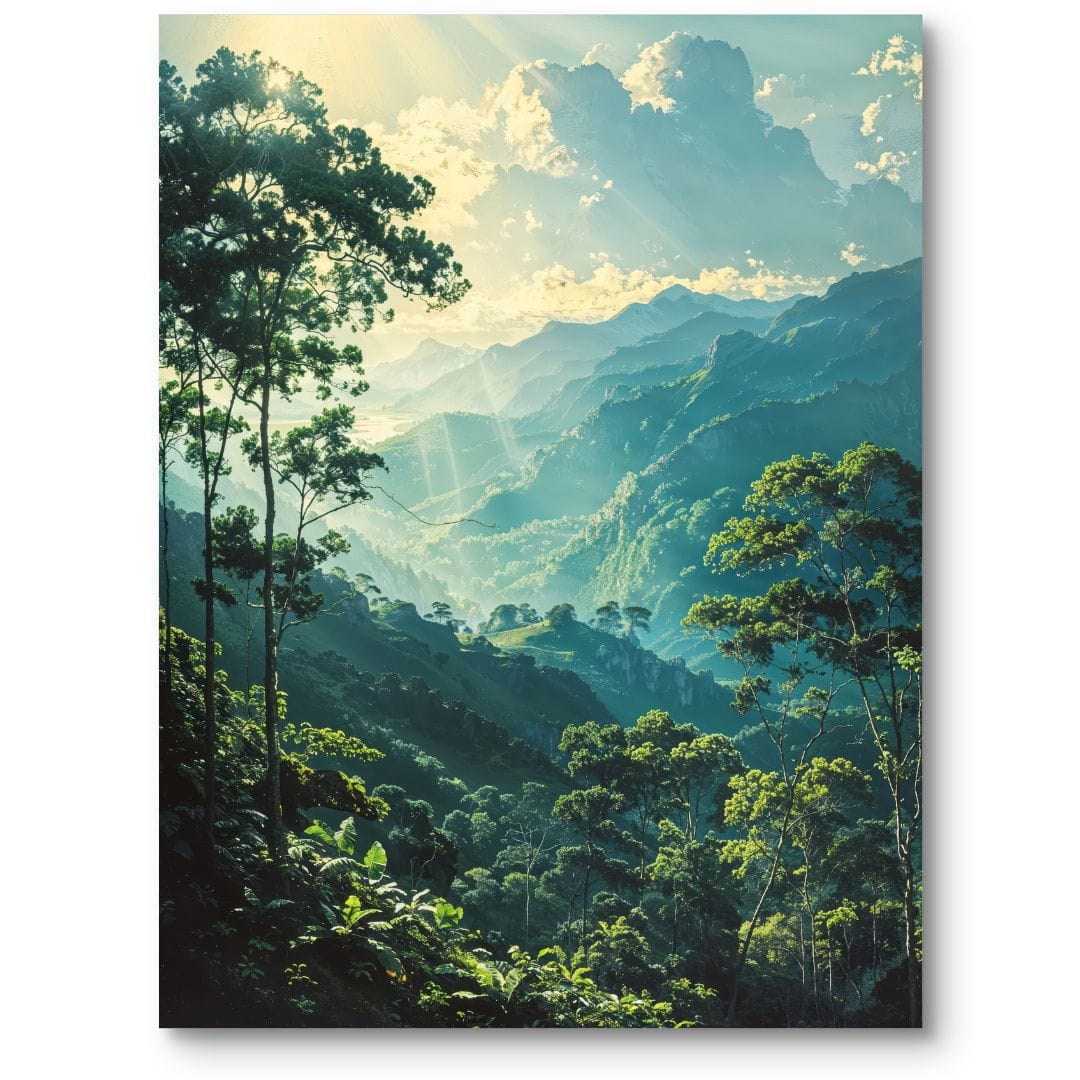 Ten obraz na płótnie przedstawia zachwycający, malowniczy pejzaż górski skąpany w ciepłym świetle poranka. W centralnej części kompozycji dominują monumentalne góry o bujnej, soczystej roślinności, które tworzą imponującą, pełną życia panoramę. Na pierwszym planie rozpościerają się strzeliste, tropikalne drzewa, budujące aurę tajemniczości i głębi. Całość sprawia wrażenie niezwykłego miejsca, w którym natura odsłania swe najpiękniejsze oblicze.