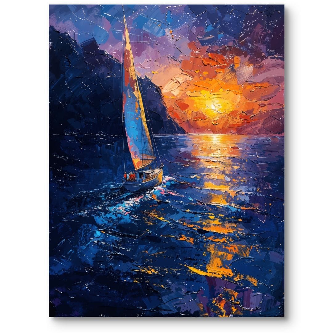 Ten obraz na płótnie ukazuje żaglówkę, która z odwagą pokonuje wzburzone fale o zachodzie słońca. Dynamiczne pociągnięcia pędzla oraz nasycone barwy oddają nie tylko potęgę natury, ale także niezwykły majestat i ulotność tej chwili.