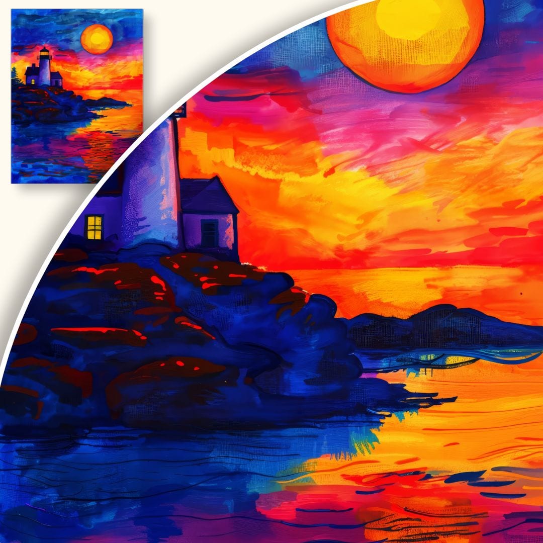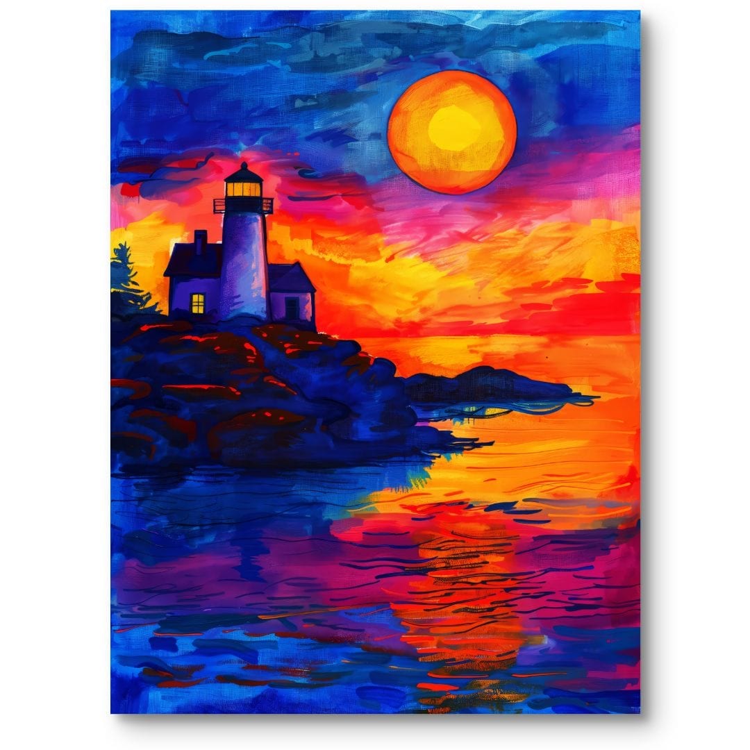 Obraz na płótnie ukazuje urzekający widok zachodu słońca nad spokojnym morzem. Na pierwszym planie góruje latarnia morska, osadzona na skalistym wybrzeżu i skąpana w ciepłych, pomarańczowych promieniach słońca. Całość kompozycji tętni żywymi barwami: głębokimi błękitami, subtelnymi fioletami i energetycznymi odcieniami pomarańczu, nadając tej scenie wyjątkowość oraz ekspresję.