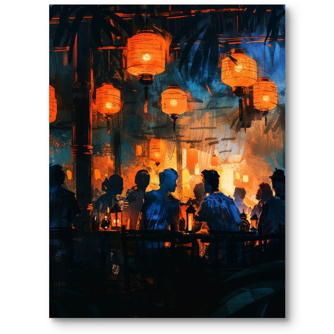 Obraz przedstawia tętniącą życiem scenę nocną w barze, gdzie zebrani w grupki ludzie zanurzeni są w aurze pomarańczowego światła lampionów. To energetyczna kompozycja oddająca atmosferę nocnych spotkań, pełnych radości, spontanicznych rozmów i wyjątkowej towarzyskiej energii.