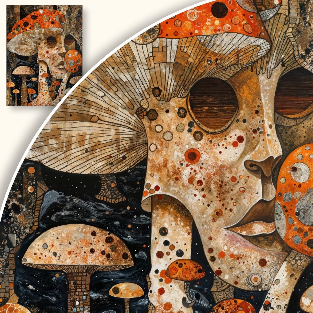 Obraz na płótnie ukazuje niezwykłe, surrealistyczne połączenie świata natury i wyobraźni człowieka. Centralnym motywem są barwne, fantazyjne grzyby, które przyjmują niemal ludzkie, dynamiczne formy. Głębokie, bogate w detale tło wprowadza widza w nastrojowy, niemal mistyczny klimat.
