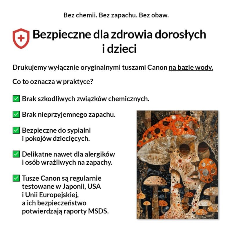 Tak, absolutnie! Drukujemy wyłącznie certyfikowanymi, bezwonnymi tuszami pigmentowymi Canon Lucia Pro na bazie wody. Są one w pełni bezpieczne dla zdrowia, nie zawierają rozpuszczalników i mogą być bez obaw stosowane w sypialniach i pokojach dziecięcych.