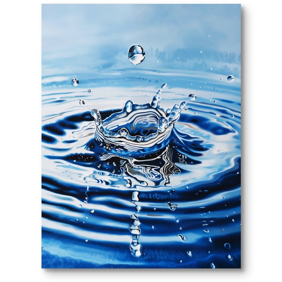 Centrum kompozycji stanowi pełen ekspresji moment zetknięcia się kropli z powierzchnią wody, otoczony harmonijnymi kręgami fal. Dominujące chłodne odcienie niebieskiego i subtelnie rozjaśnione biele budują aurę świeżości i spokoju, kierując wzrok widza ku centralnemu punktowi dzieła.