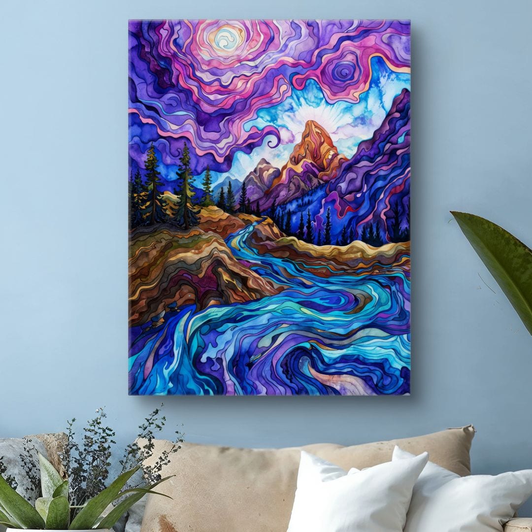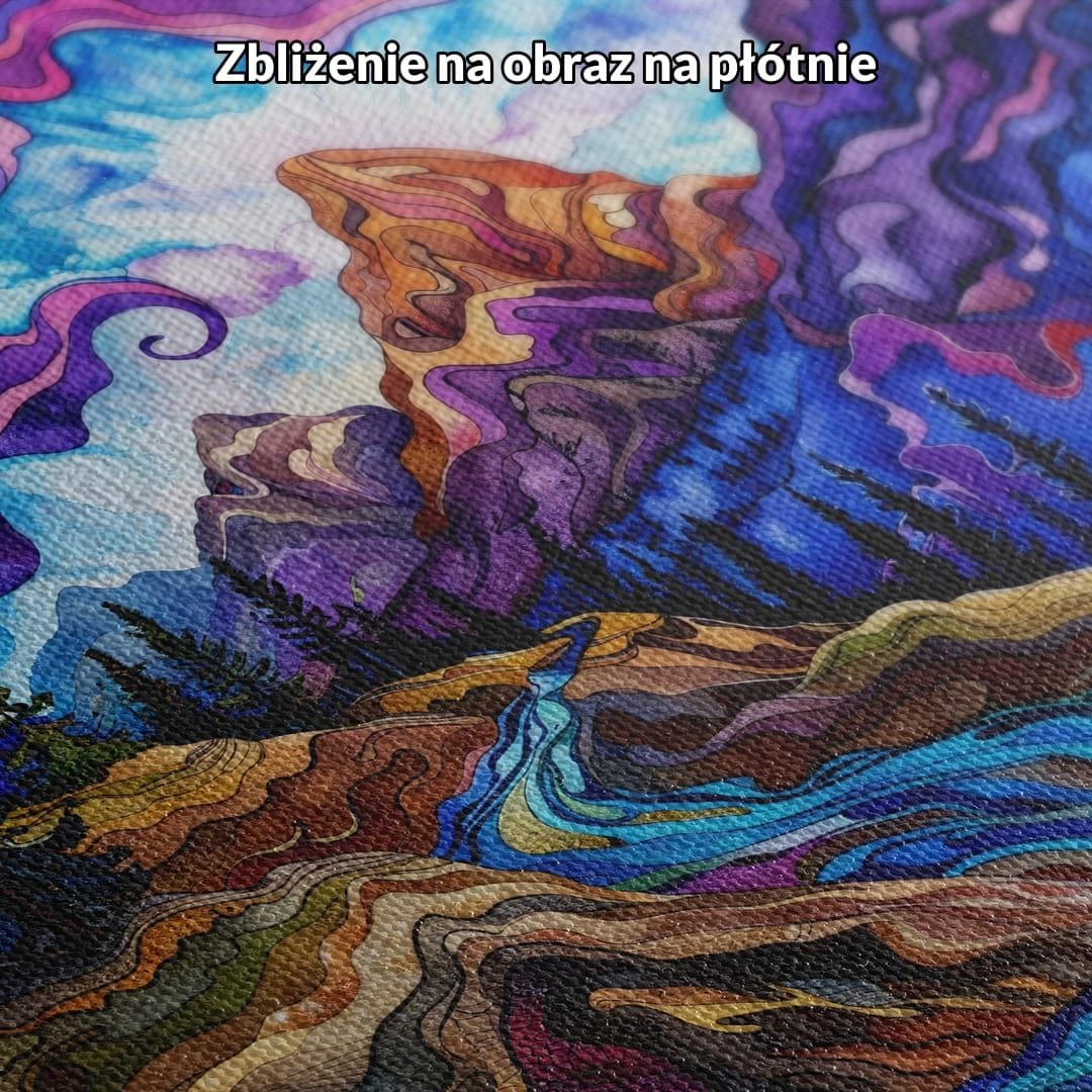 Obraz na płótnie prezentuje zjawiskowy, abstrakcyjny krajobraz górski, zatopiony w hipnotyzujących fioletach, błękitach i odcieniach zieleni. Na pierwszym planie malowniczo wijąca się rzeka prowadzi wzrok ku majestatycznym, opalizującym górom, podczas gdy towarzyszące jej drzewa wzdłuż brzegów wnoszą organiczną głębię do tej niezwykłej kompozycji.