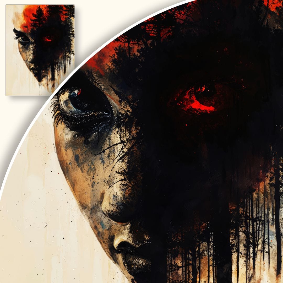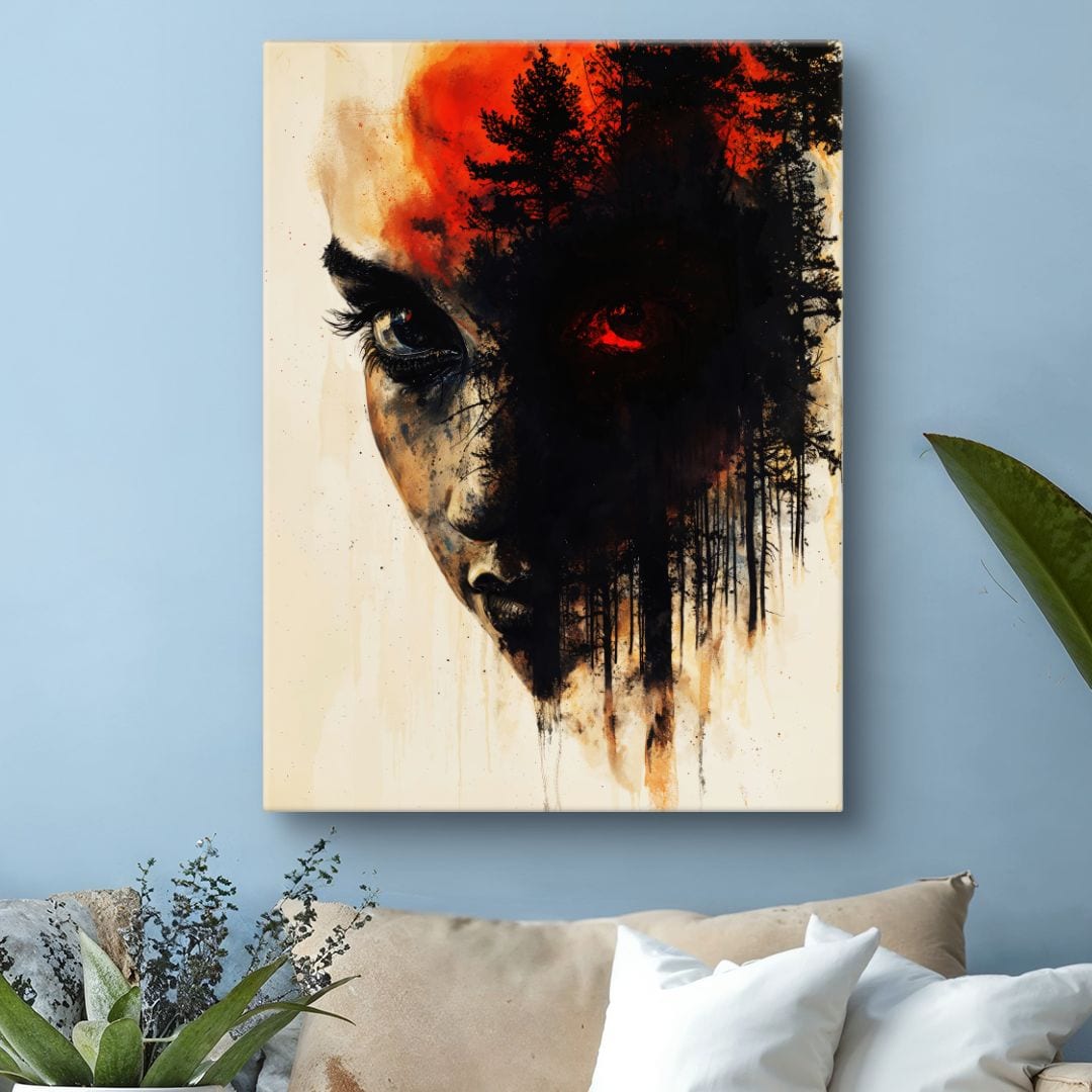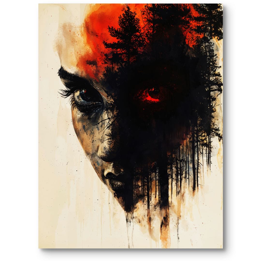 Obraz na płótnie ukazuje tajemniczą, kobiecą twarz skrytą w surrealistycznej scenerii leśnej. Ostry kontrast pomiędzy monochromatycznym, ciemnym lasem a wyrazistą, czerwoną aurą wprowadza głębię emocji i niezwykłą intensywność. To dzieło nasycone abstrakcją, przywołujące niepokój i fascynującą aurę tajemnicy.