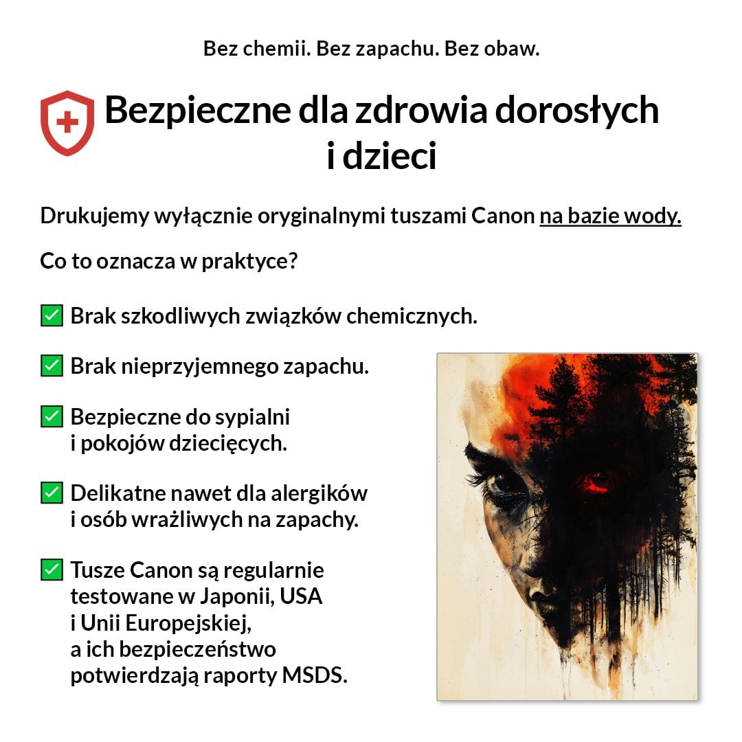 Tak, absolutnie! Drukujemy wyłącznie certyfikowanymi, bezwonnymi tuszami pigmentowymi Canon Lucia Pro na bazie wody. Są one w pełni bezpieczne dla zdrowia, nie zawierają rozpuszczalników i mogą być bez obaw stosowane w sypialniach i pokojach dziecięcych.