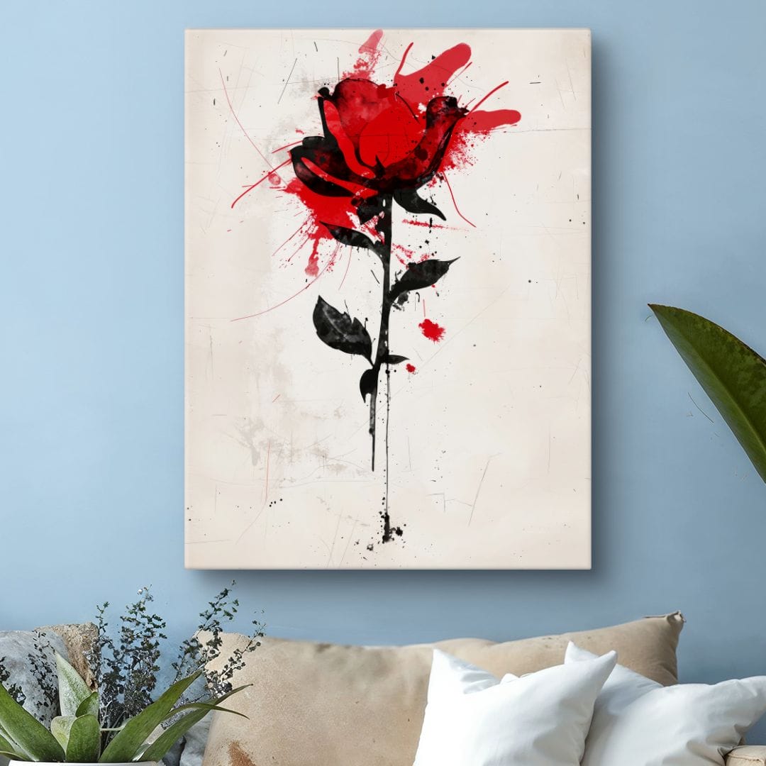 Prezentowany obraz to niecodzienna, abstrakcyjna wizja róży, w której kwiat ten – odwieczny symbol miłości i piękna – nabiera nowego, ekspresyjnego charakteru. Dynamiczna kompozycja oraz śmiałe połączenie czerwieni i czerni na jasnym tle przełamują utarte schematy, wprowadzając do wnętrza świeżość oraz odrobinę tajemniczości.