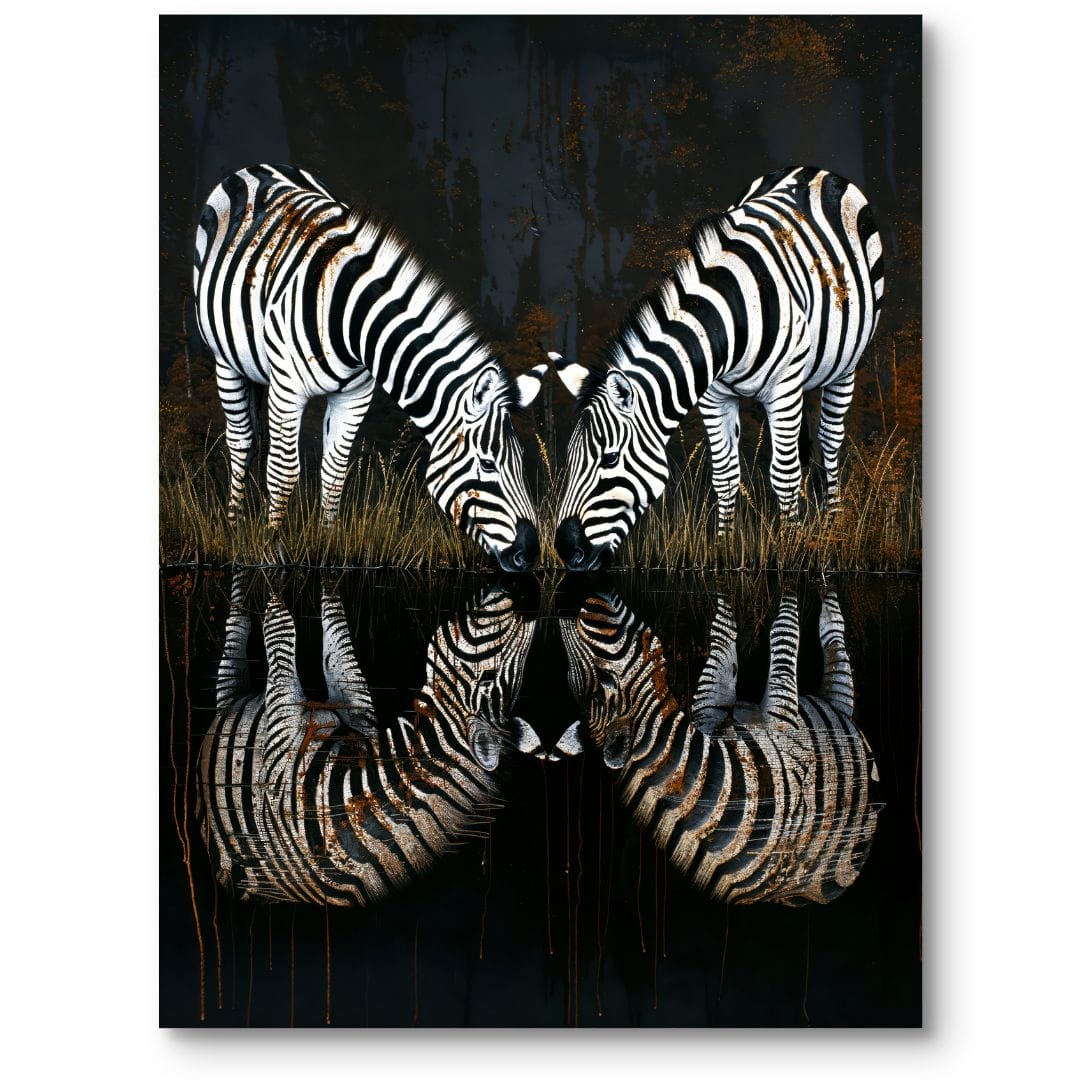 Obraz na płótnie ukazuje dwie zebry, pochylone nad lśniącą taflą wody, gdzie ich sylwetki tworzą niemal hipnotyzujące, symetryczne odbicie. Każdy detal – od misternych pasków po subtelne cienie – odwzorowano z niezwykłą precyzją, dzięki czemu dzieło przyciąga wzrok i budzi zachwyt realizmem. Motywy dzikiej przyrody sprawiają, że to propozycja idealna dla wszystkich, którzy kochają zwierzęta i naturalne piękno.
