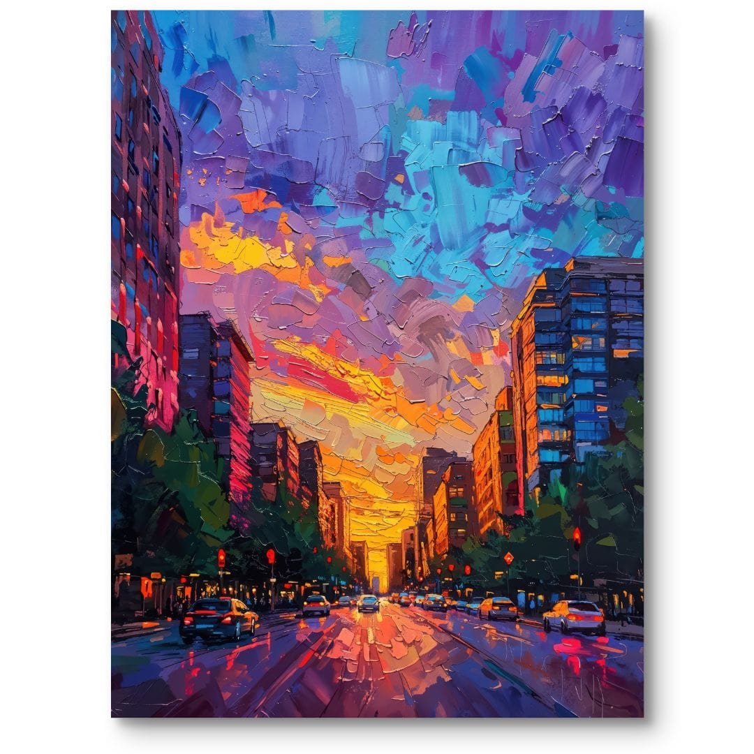 Pionowe linie nowojorskich drapaczy chmur przeplatają się z poziomymi pasami miejskich arterii, co buduje atrakcyjną iluzję głębokiej perspektywy. Dominują intensywne odcienie fioletu, pomarańczy i błękitu, pogłębiając dramatyzm oraz oddając niepowtarzalny klimat nocnego miasta.