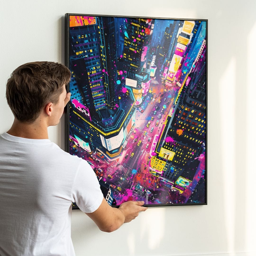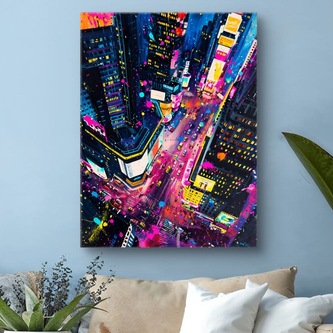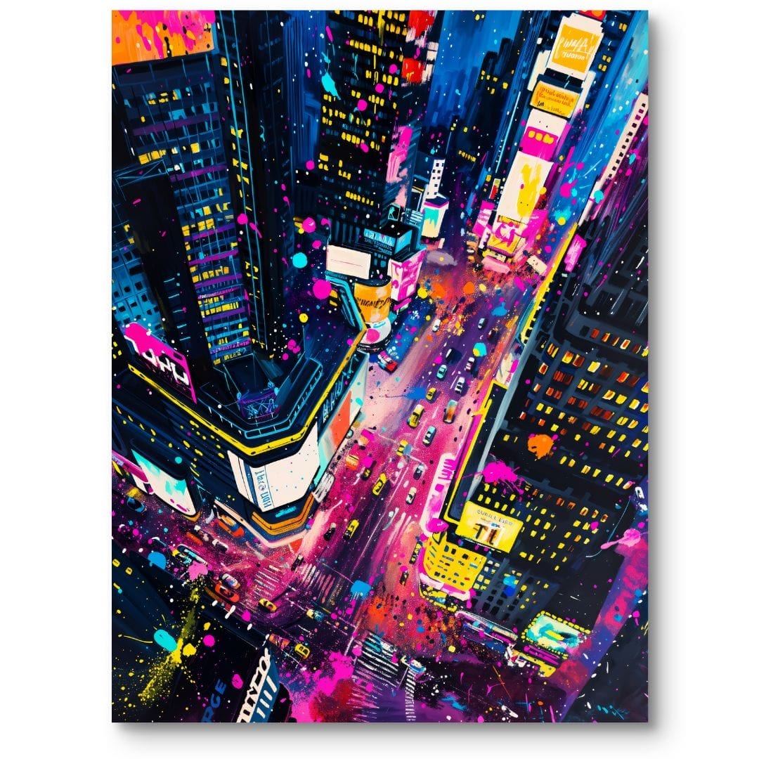 Obraz na płótnie ukazuje tętniące życiem miasto nocą, rozświetlone feerią neonowych barw i pulsujących świateł ulicznych. Zatopiony w kalejdoskopie kolorów i dynamicznej energii, krajobraz miejski przyciąga uwagę intensywnością swojej atmosfery. Wrażenie nieustannego ruchu i gwaru ulic przywodzi na myśl słynny nowojorski Times Square – miejsce, w którym energia miasta osiąga swoje apogeum.