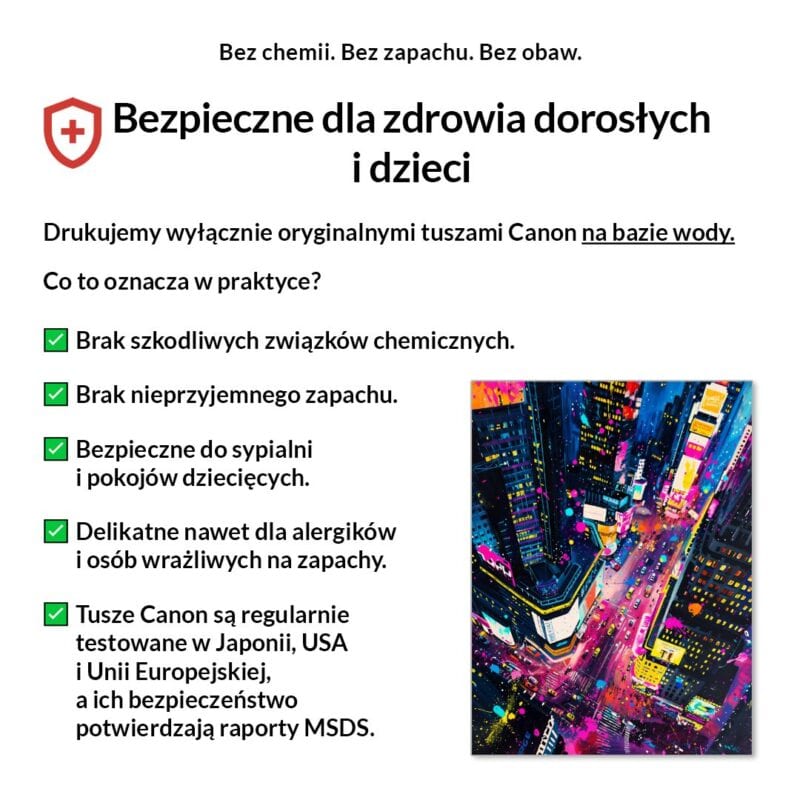 Tak, absolutnie! Drukujemy wyłącznie certyfikowanymi, bezwonnymi tuszami pigmentowymi Canon Lucia Pro na bazie wody. Są one w pełni bezpieczne dla zdrowia, nie zawierają rozpuszczalników i mogą być bez obaw stosowane w sypialniach i pokojach dziecięcych.