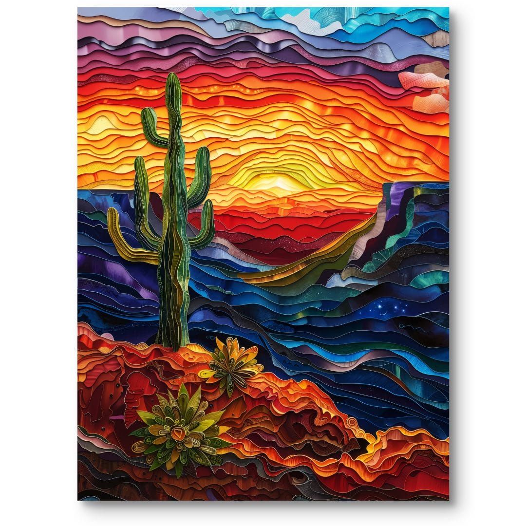 Pustynne pejzaże od wieków fascynują artystów swą prostotą i siłą, będąc symbolem samotności, wytrwałości oraz niekończącego się piękna natury. W sztuce zachodów słońca motyw pustyni często pojawiał się u takich twórców jak Georgia O’Keeffe, której malarstwo słynęło z ukazywania surowego, energetycznego charakteru południowo-zachodniej części Stanów Zjednoczonych. Kaktus – serce tego obrazu – to nie tylko roślina przystosowana do trudnych warunków, ale również metafora odporności ducha.