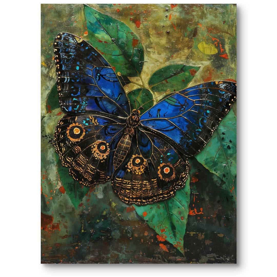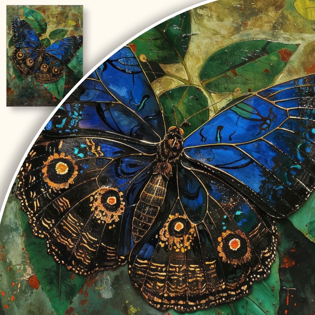 Motyl umieszczony jest centralnie na tle soczystej zieleni liści, a łagodne, rozproszone światło wydobywa subtelność kształtów i intensywność barw. Dominujące odcienie niebieskiego i zieleni przepięknie kontrastują z czernią wzoru na skrzydłach, podczas gdy rozmyte tło wprowadza efekt głębi i skupia uwagę na głównym bohaterze obrazu.