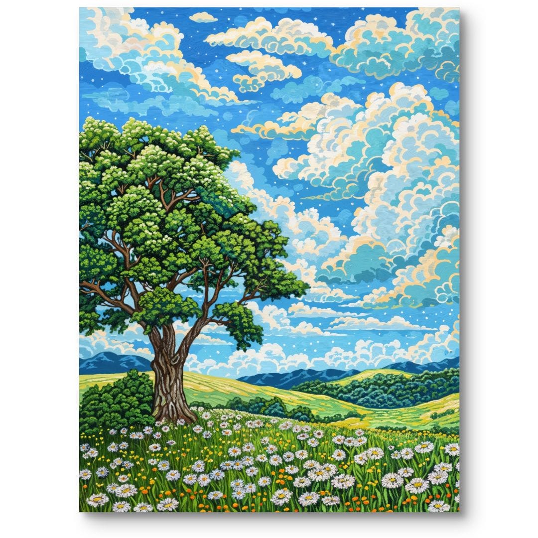 Obraz na płótnie prezentuje malowniczy, wiosenny pejzaż, którego centralnym elementem jest imponujące drzewo stojące pośród kwitnącej łąki. Subtelnie ukazane pagórki i szerokie pola w tle rozciągają się pod błękitnym niebem, delikatnie przysłoniętym przez chmury. Ta scena stanowi hymn na cześć piękna natury w rozkwicie, przywołując uczucie harmonii i wytchnienia wiosennego dnia.