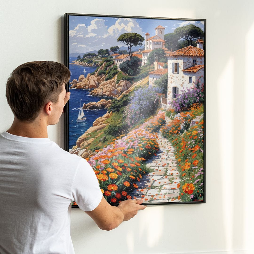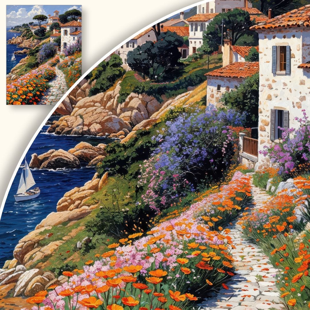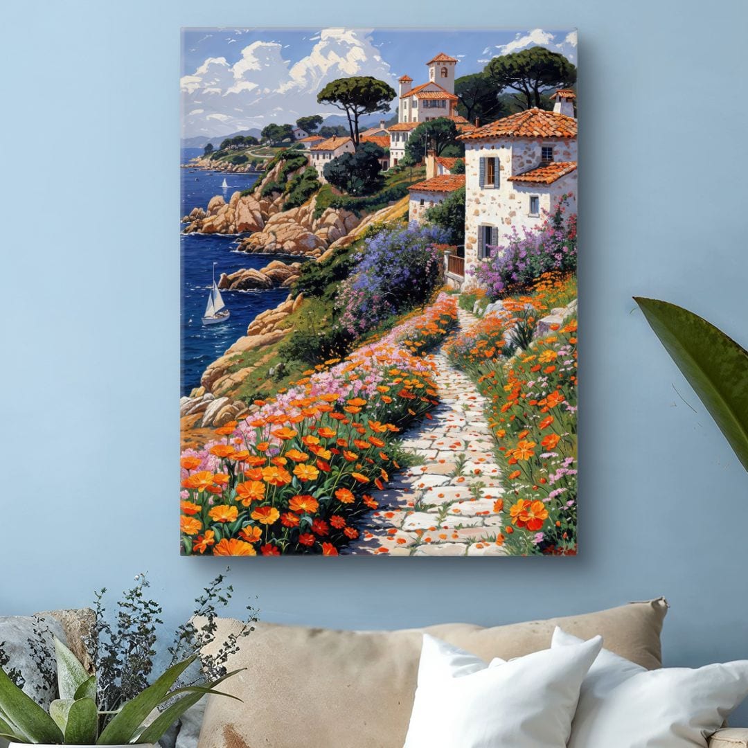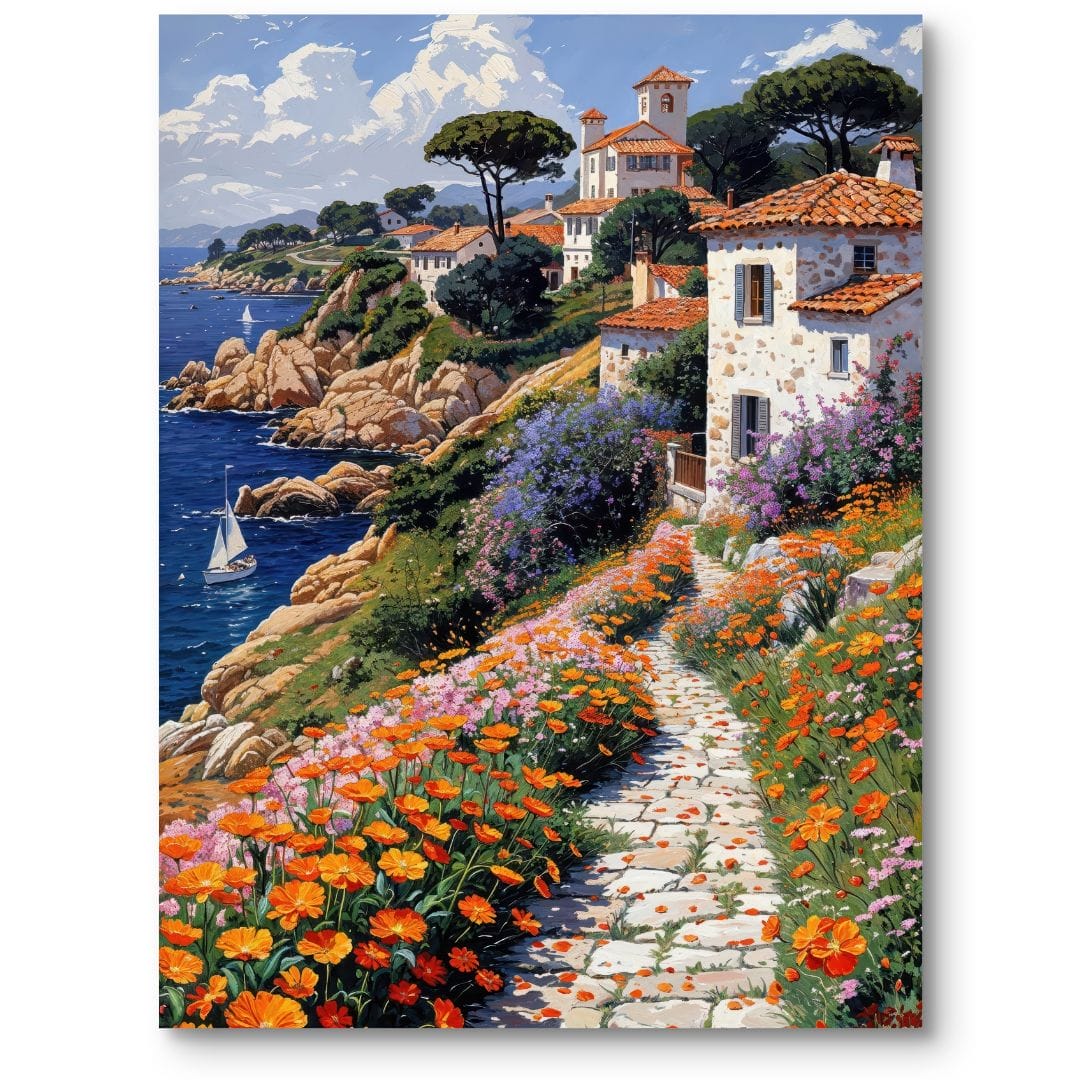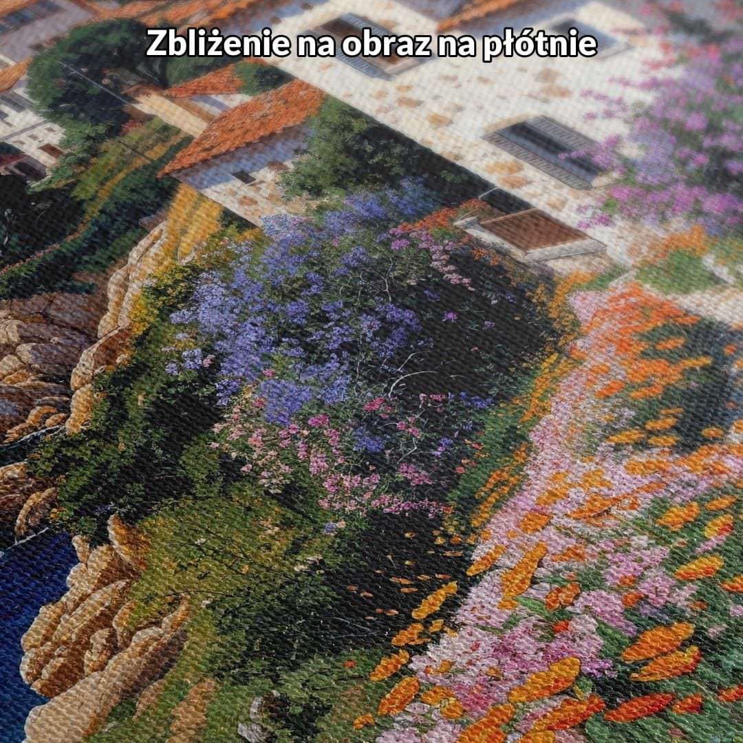 Ten urokliwy obraz na płótnie przenosi widza do malowniczej nadmorskiej wioski, otulonej bujnymi, kolorowymi kwiatami. Wiodąca wśród roślin ścieżka prowadzi ku białym domom o czerwonych dachach, które są charakterystyczne dla urokliwych terenów śródziemnomorskich. Na horyzoncie spokojne, błękitne morze zdobi samotna żaglówka, podkreślając sielankowy nastrój tej sceny. Barwna roślinność i nasycone kolory nieba nadają całości niepowtarzalny, żywy klimat.